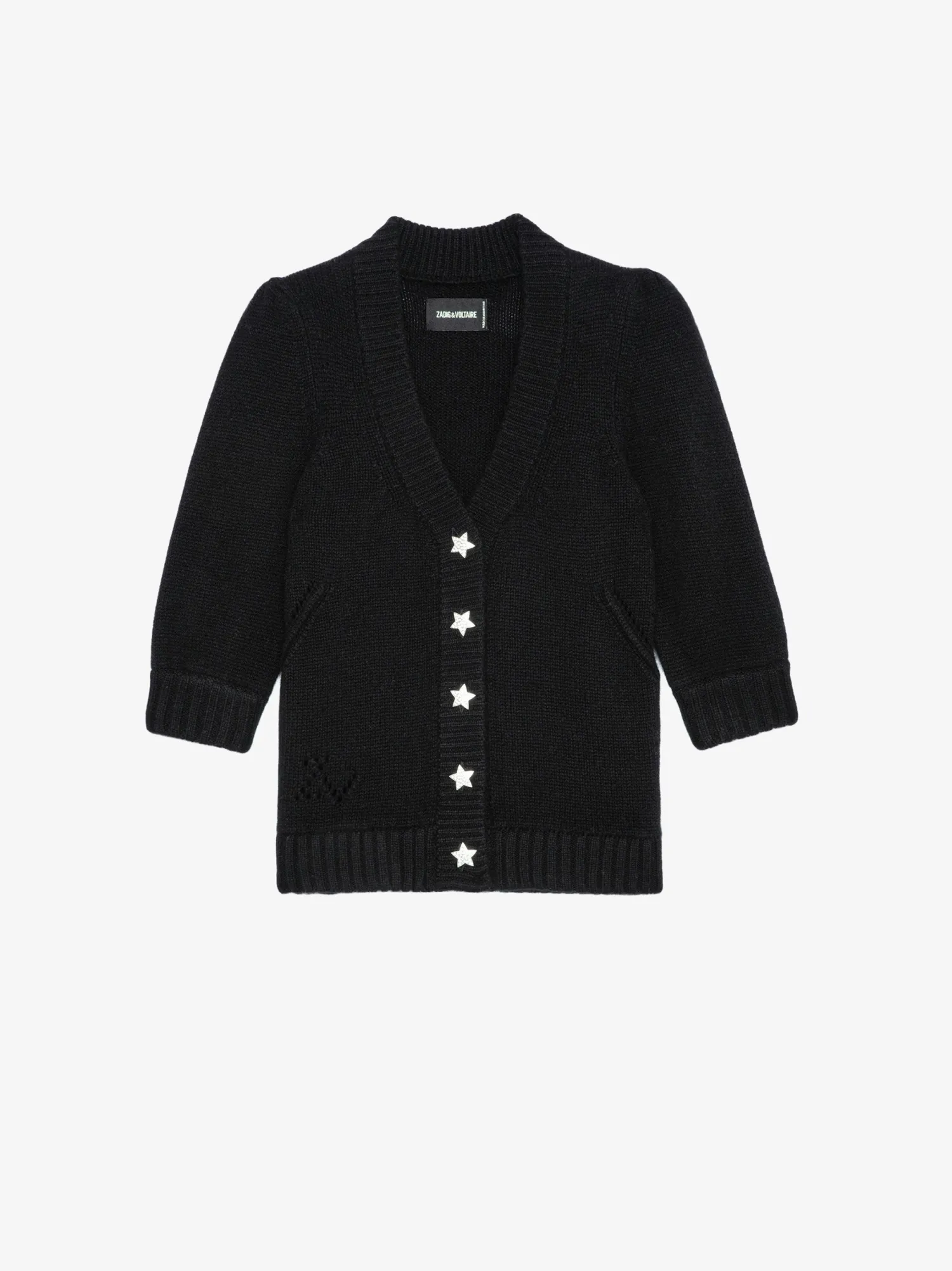 The Betsy soft cashmere cardigan features full sleeves and a star-shaped jewel button closure. – Zadig&Voltaire women’s black cashmere cardigan – 3/4 sleeves – Star jewel buttons – Contrasting edges – Full shoulders – Made in Mauritius- Product code: KWCA00521_NOIR- 100% cashmere- The cashmere for this product is produced according to The Good Cashmere Standard® by AbTF. The standard ensures the welfare of the cashmere goats, protects natural resources and supports the local farmers that produce it.- Hand or machine wash your knitwear at 68°F in a pillowcase or washing bag. Do not use fabric softener or leave your knit soaking in water. The spin speed must not exceed 400 rpm. Dry flat on a towel away from direct sunlight and heat.