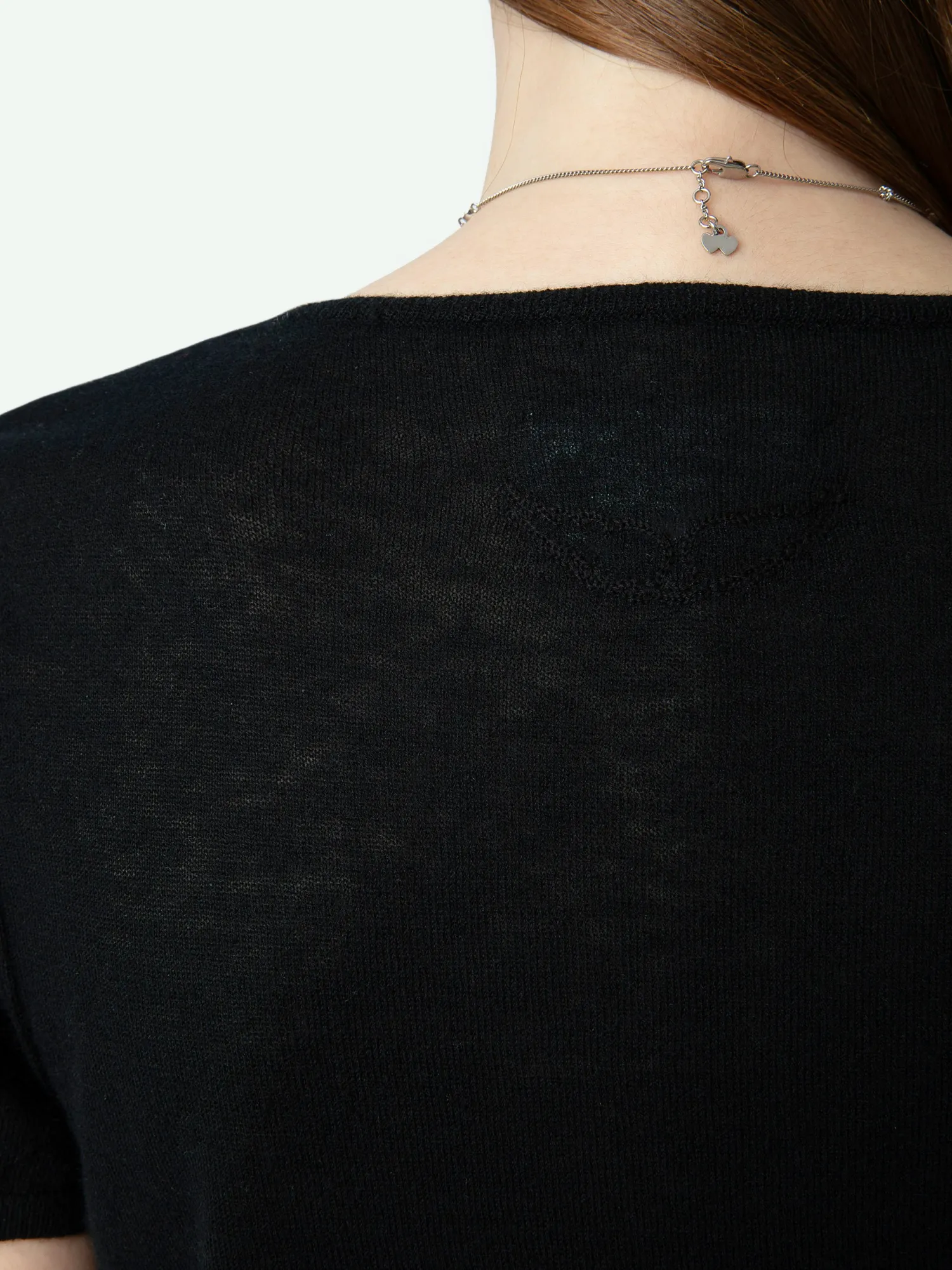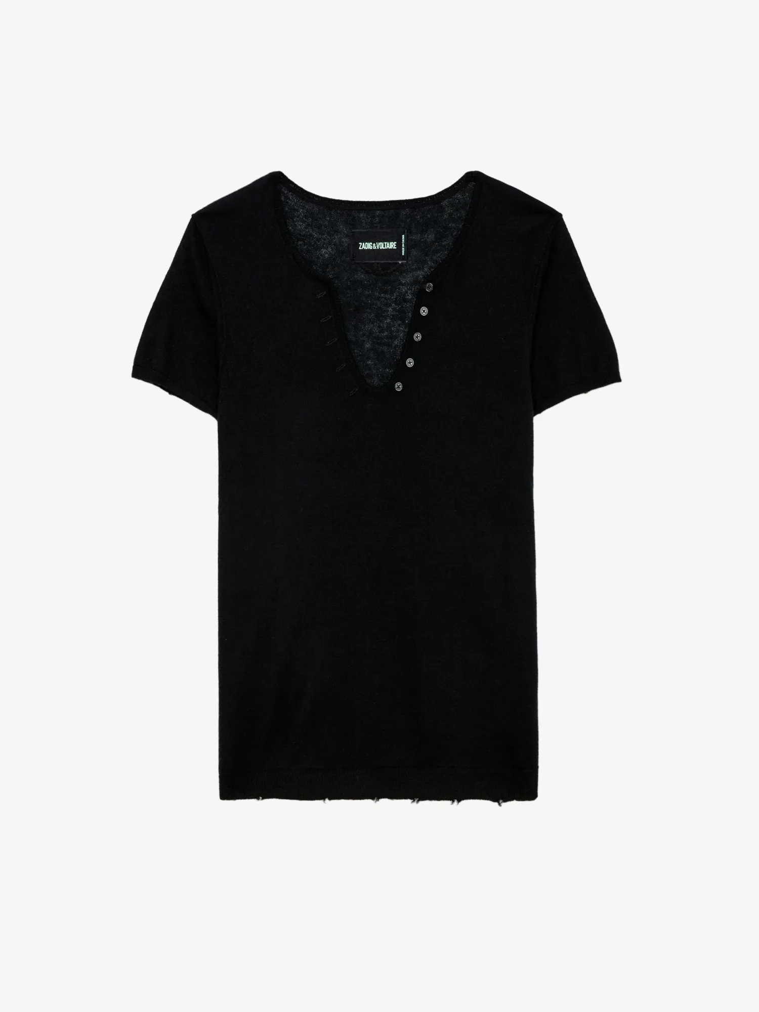 – Women’s black feather cashmere sweater – Henley T-shirt with 5 buttons on a round neck – Short sleeves and ribbed edges with distressed effect – Signature wings embroidered on the back – Naturally warm feather cashmere is lighter and more delicate than traditional cashmere. It offers a finer knit, making this an exceptional piece.