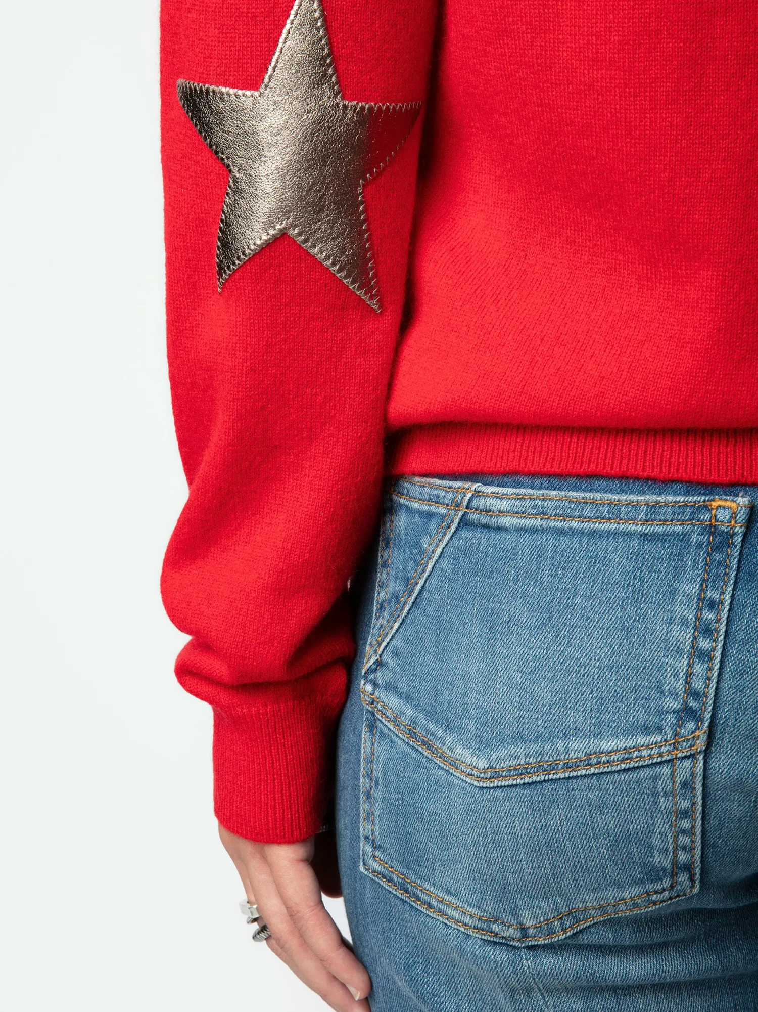 – Women’s Cherry red cashmere sweater – Metallic star patches embroidered on elbows – Round neck – Long sleeves and ribbed edges – Pointelle ZV signature