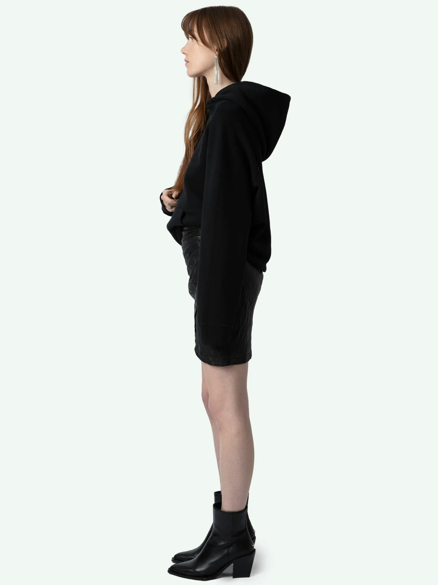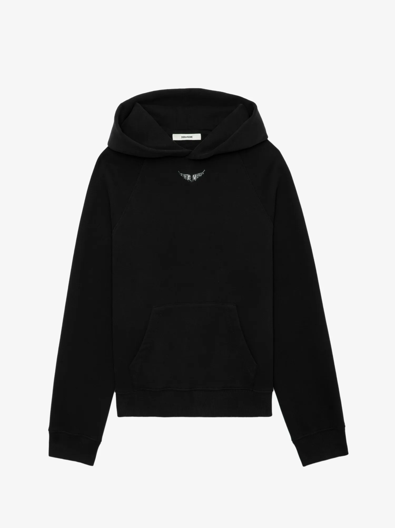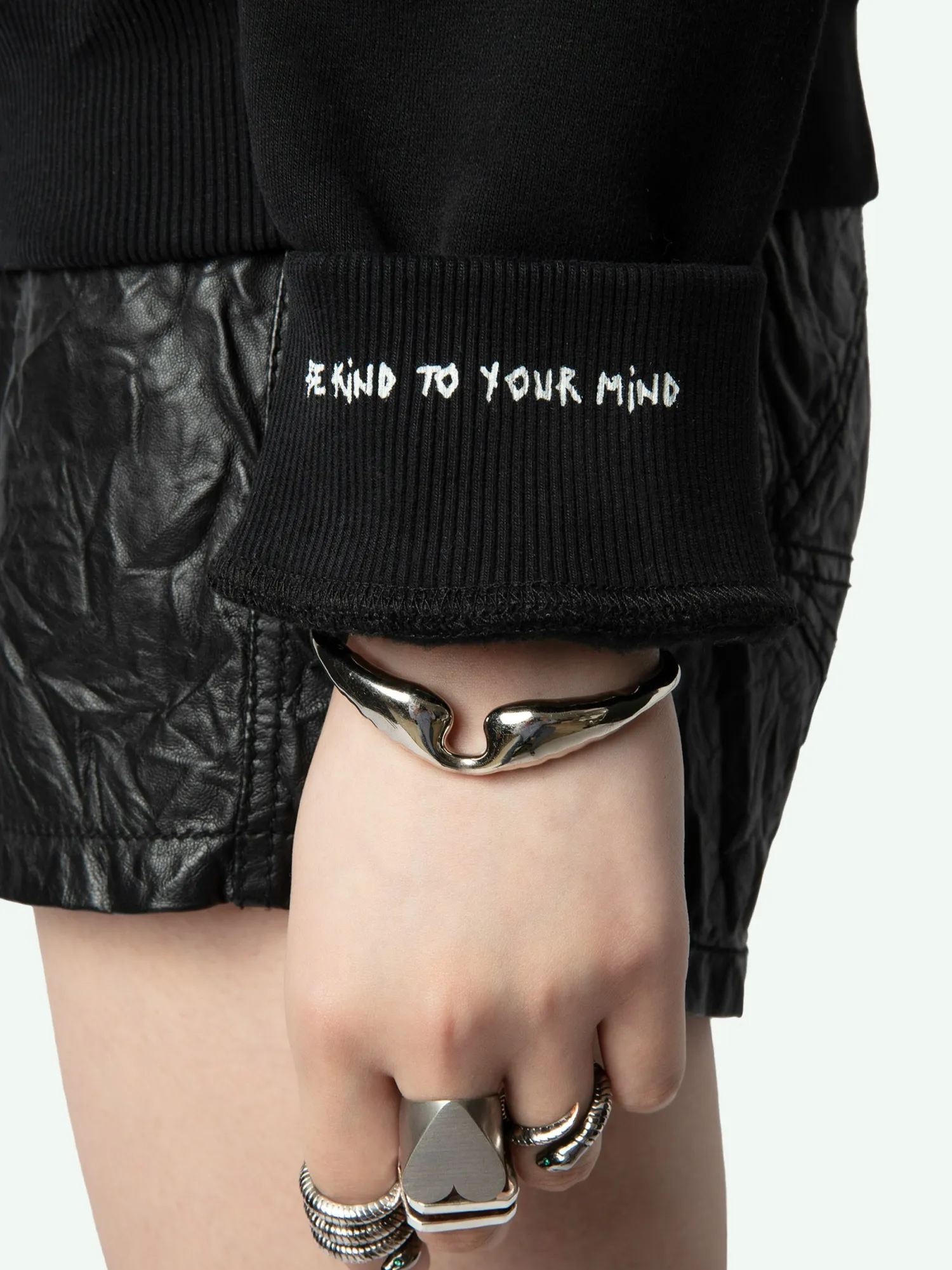 – Women’s black baggy sweatshirt – ‘Be Kind To Your Mind’ message on the inside of the sleeve – Hood – Front pocket – Long sleeves and ribbed edges – Signature ZV wings embellished with diamante on the back