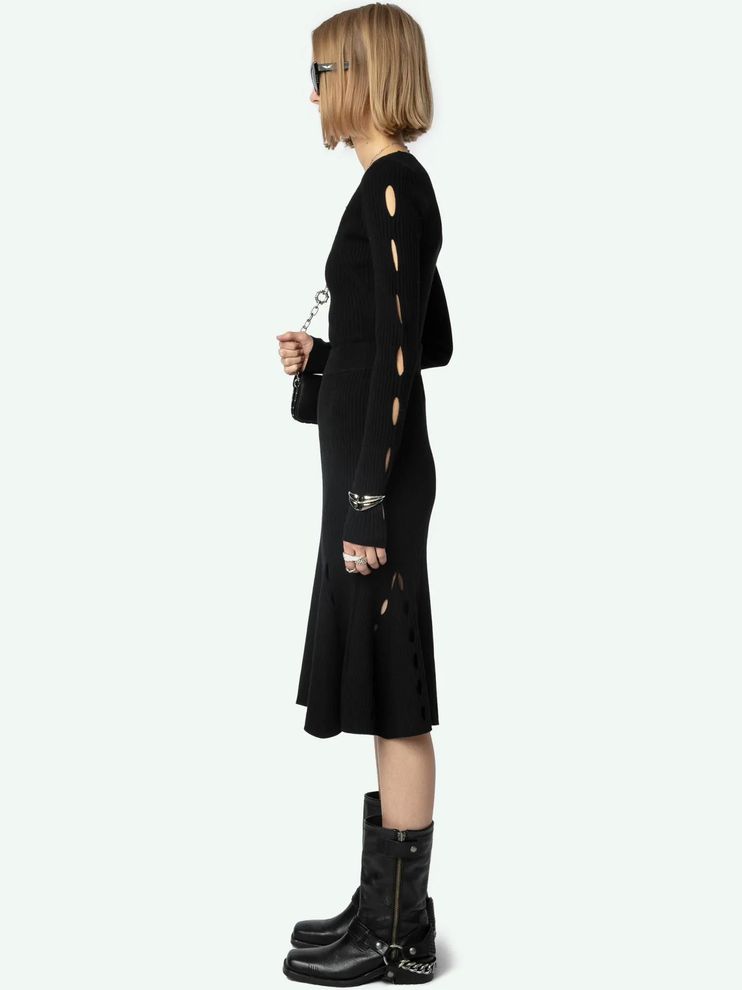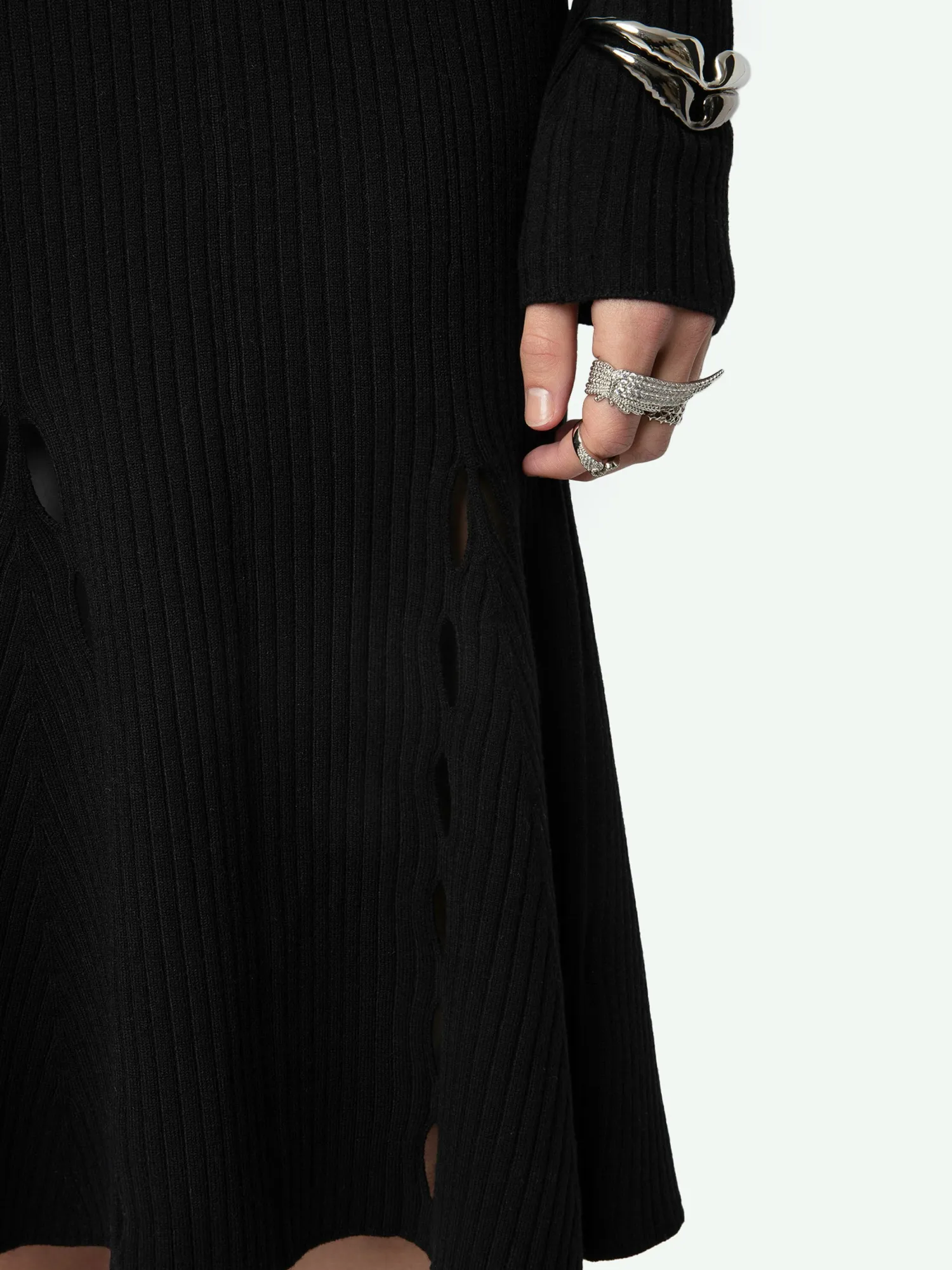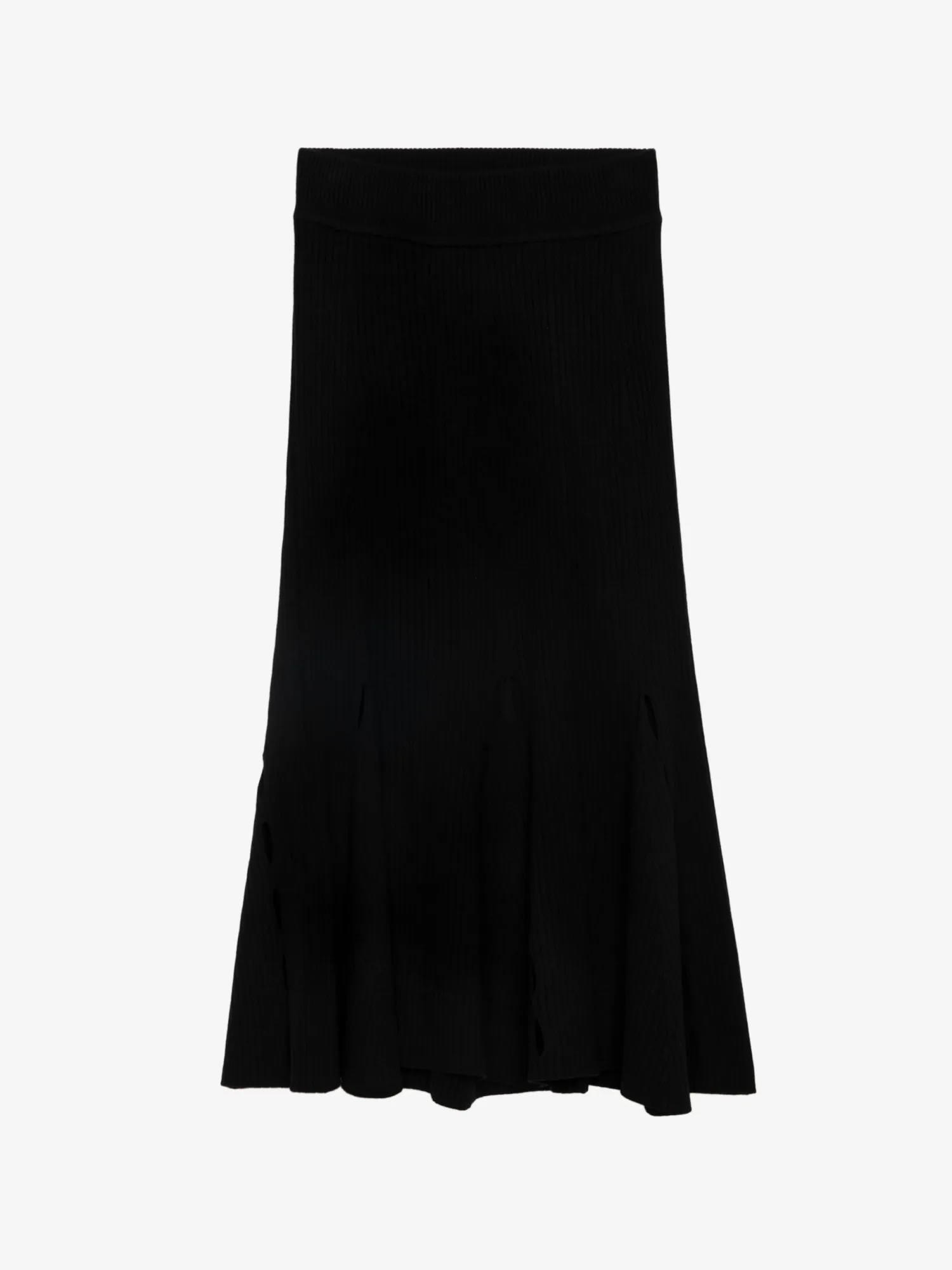 – Women’s black ribbed merino wool midi skirt – Elasticated waist – Graphic openwork cut-outs at the hem – Flared