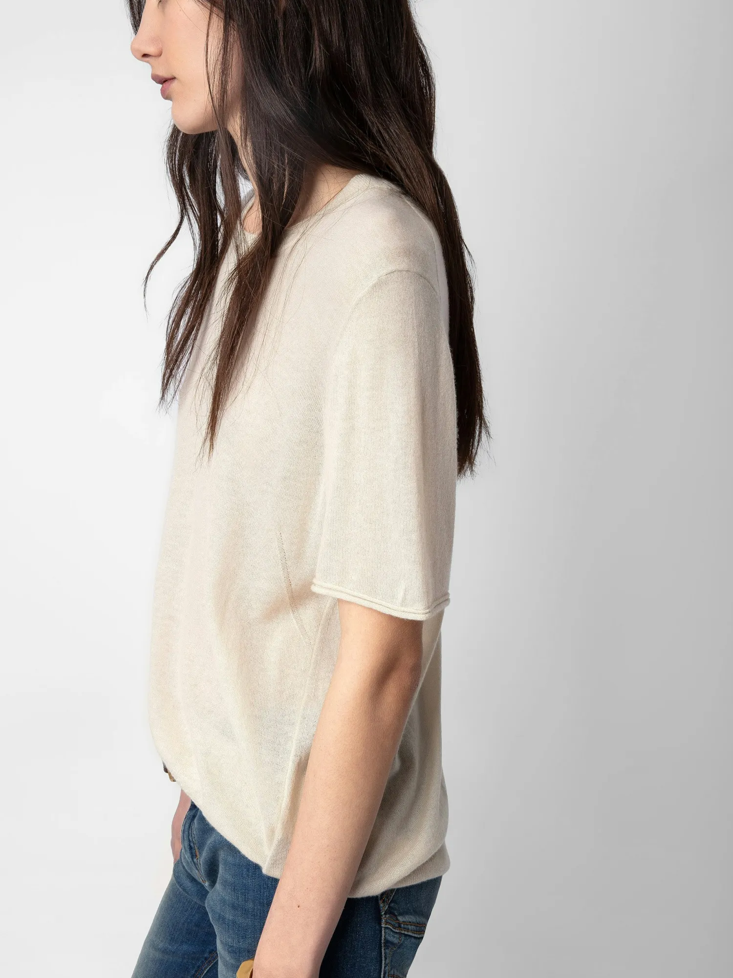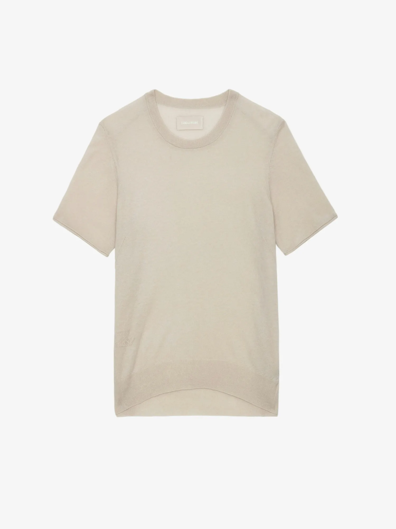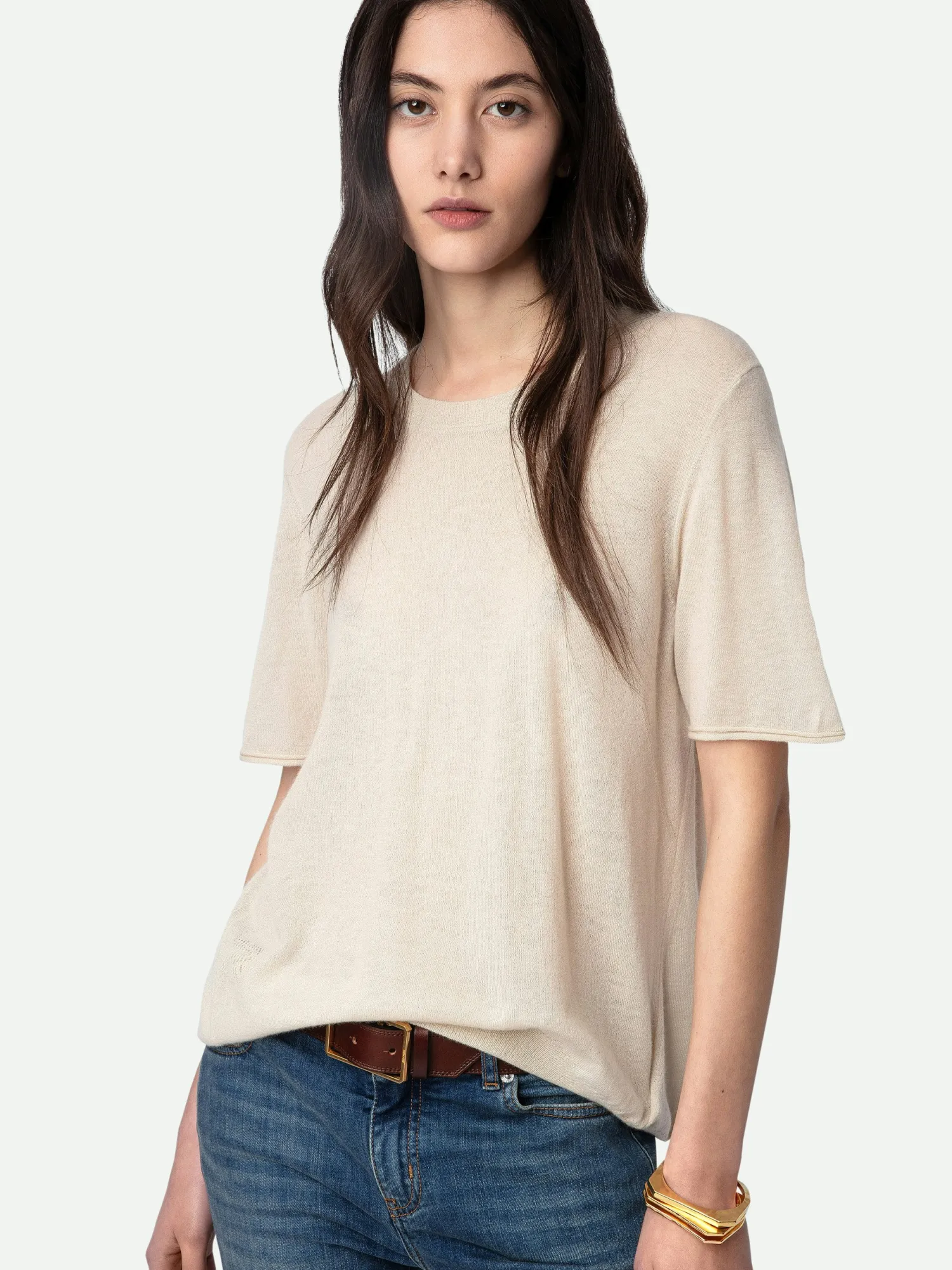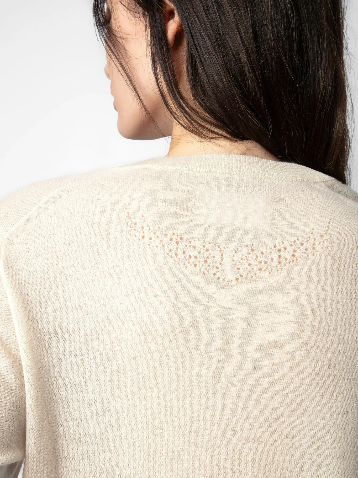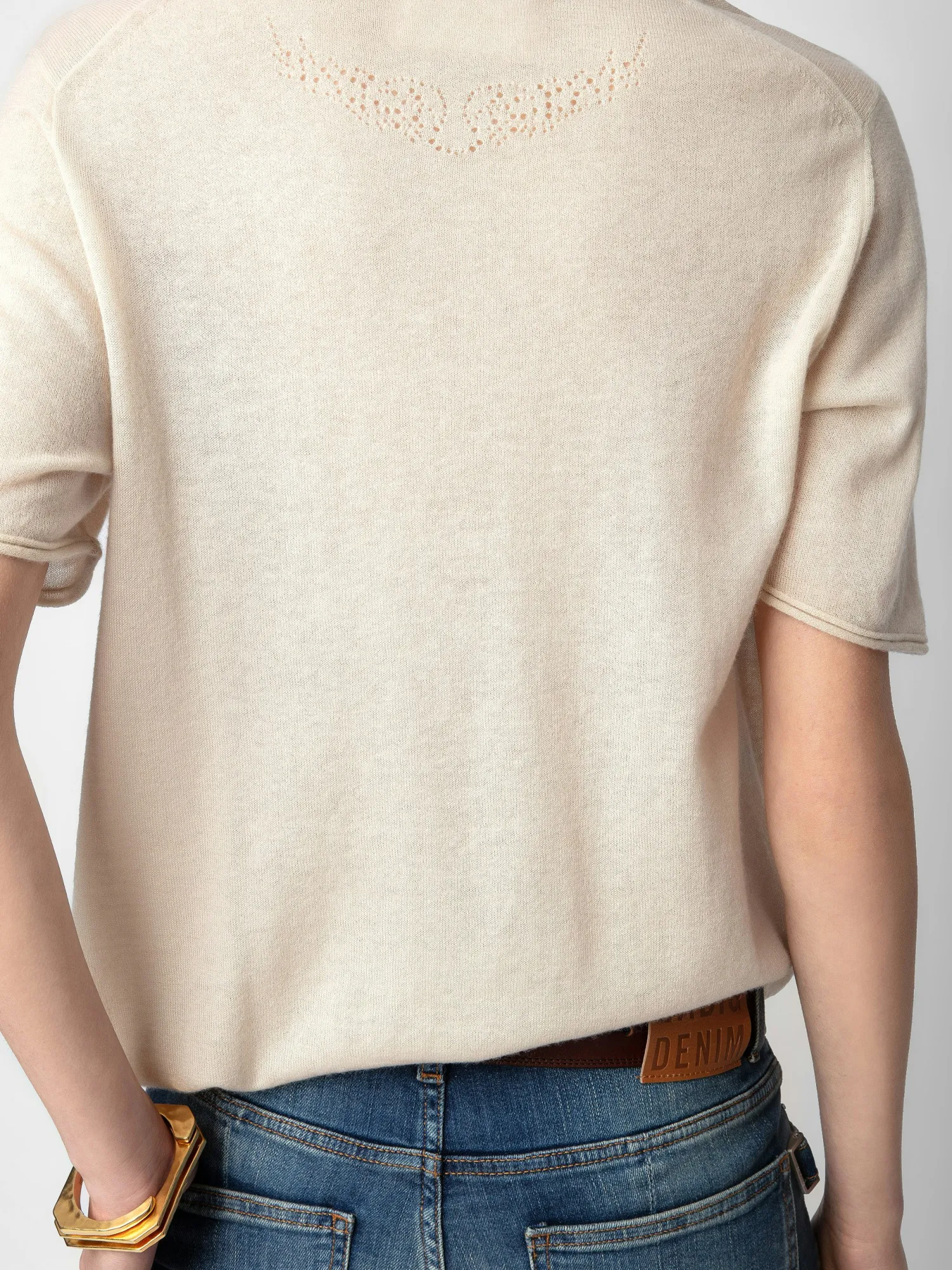 – Women’s Judo beige feather cashmere sweater – Openwork wings motifs on the back – Round neckline – Short sleeves, pointelle ZV signature and ribbed trim