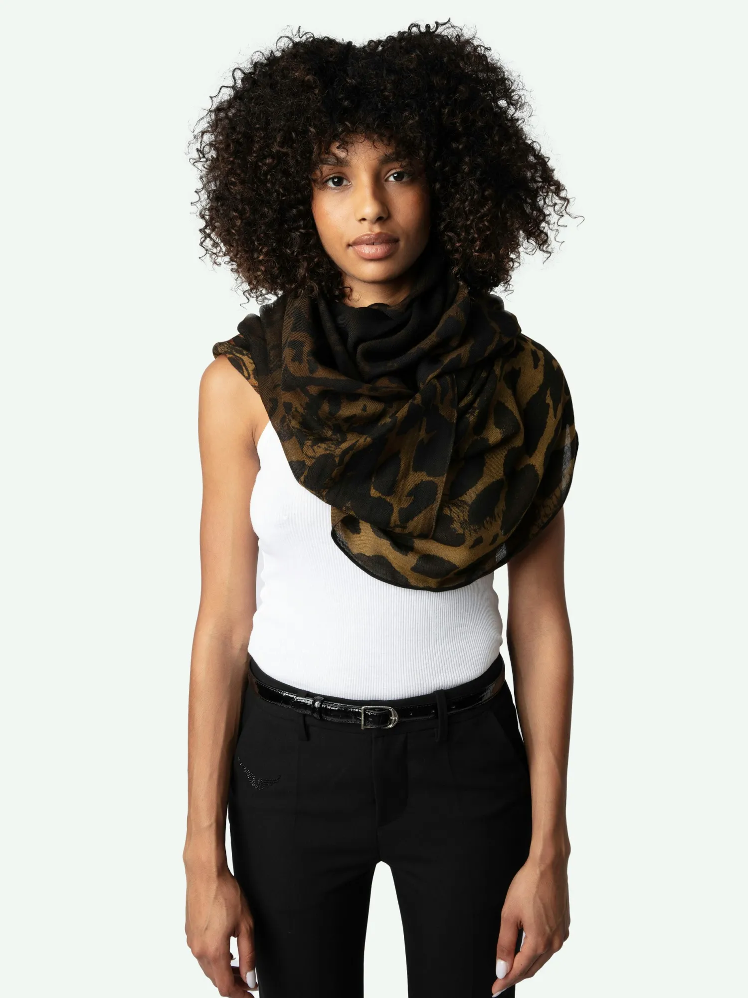 – Women’s Latte brown wool rectangle scarf – Leopard print with tie & dye effect and Zadig&Voltaire signature – Fringed edges
