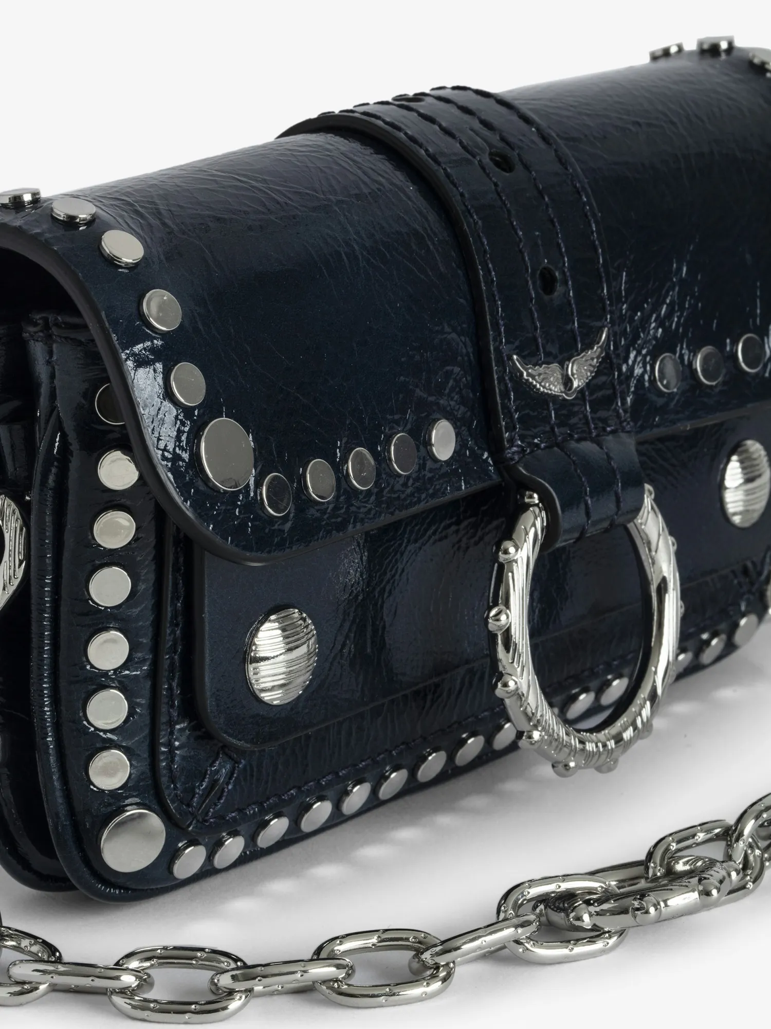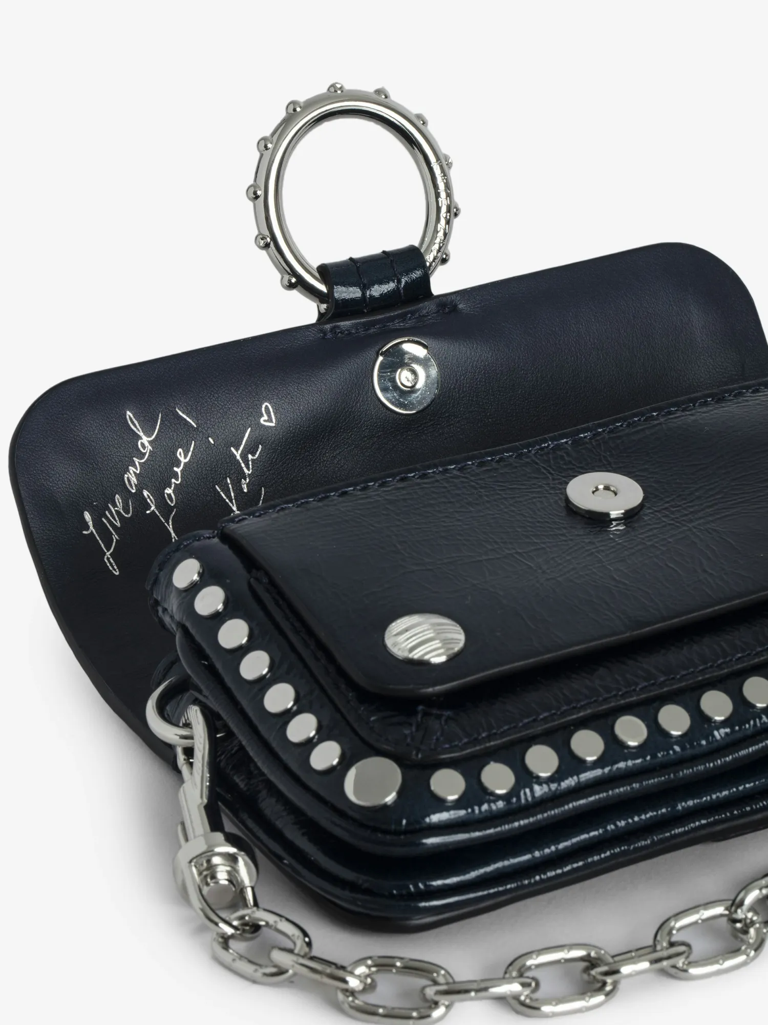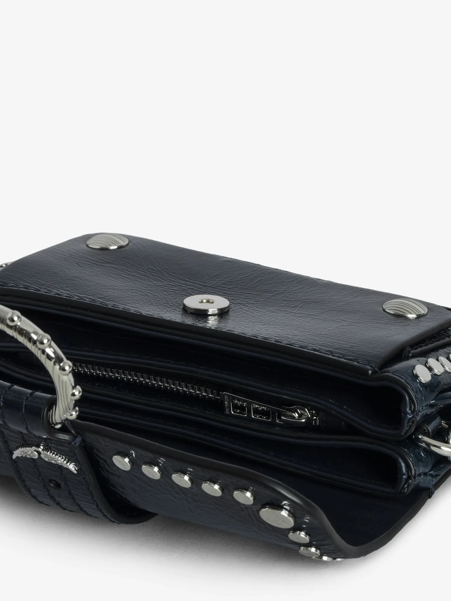 – Women’s Kate Wallet bag in glossy Ink blue leather with crinkled effect – Removable metal chain – Flap with magnetic fastening – Two compartments separated by a zipped pocket and 2 card slots – Studded details, wings and metal ring engraved with "Kate Loves Zadig&Voltaire" – Can be carried in the hand or worn on the shoulder or across the body