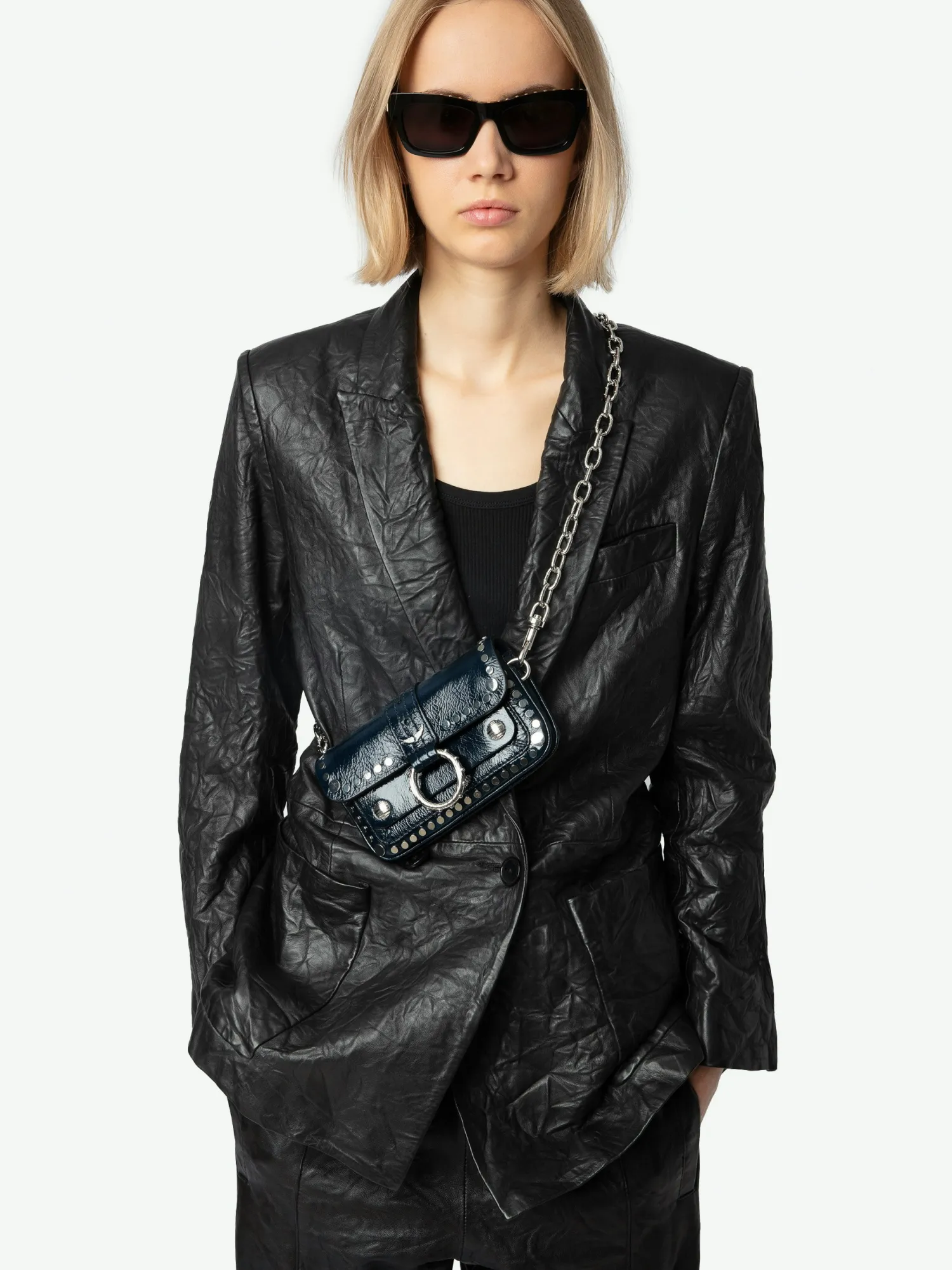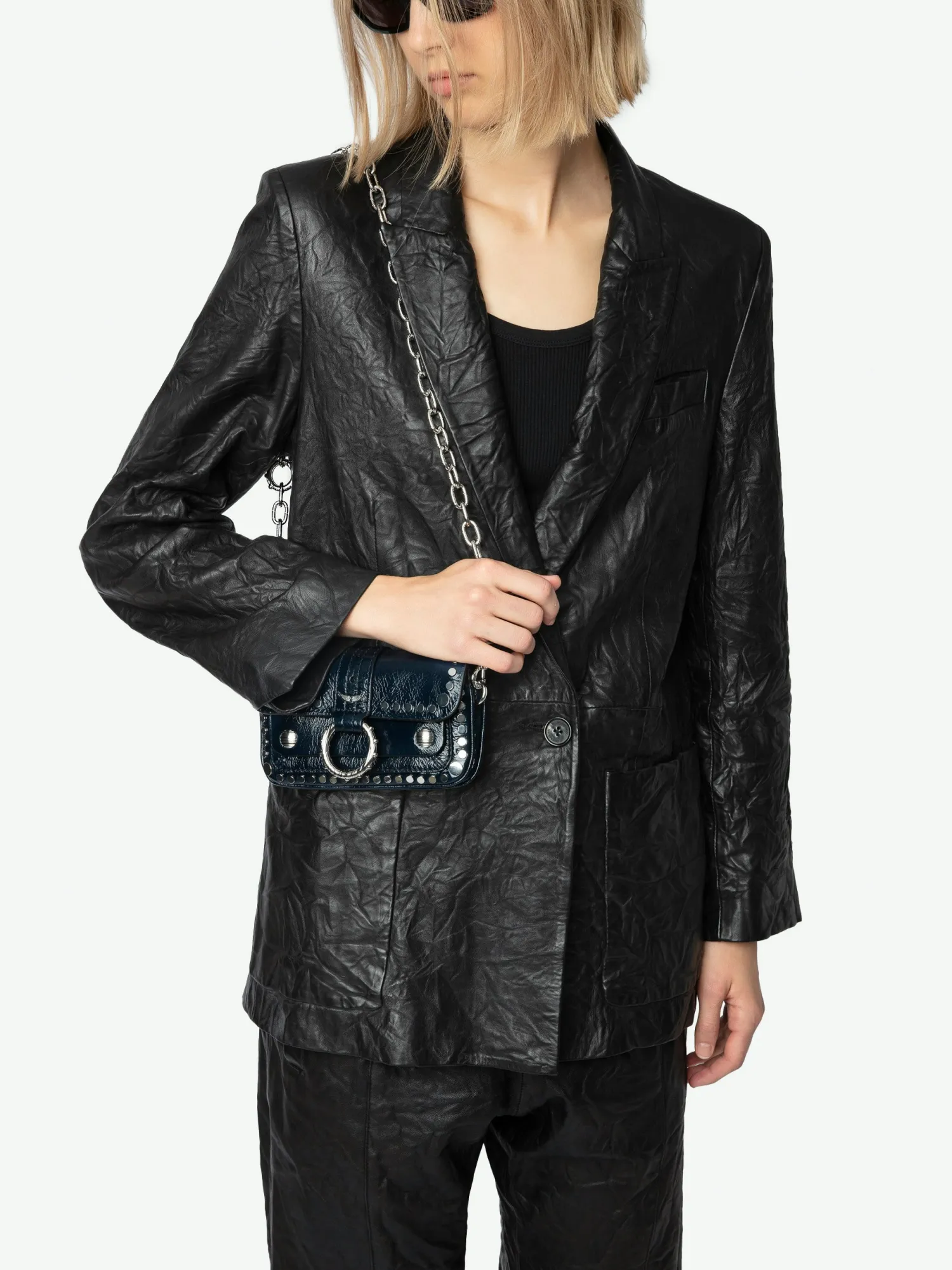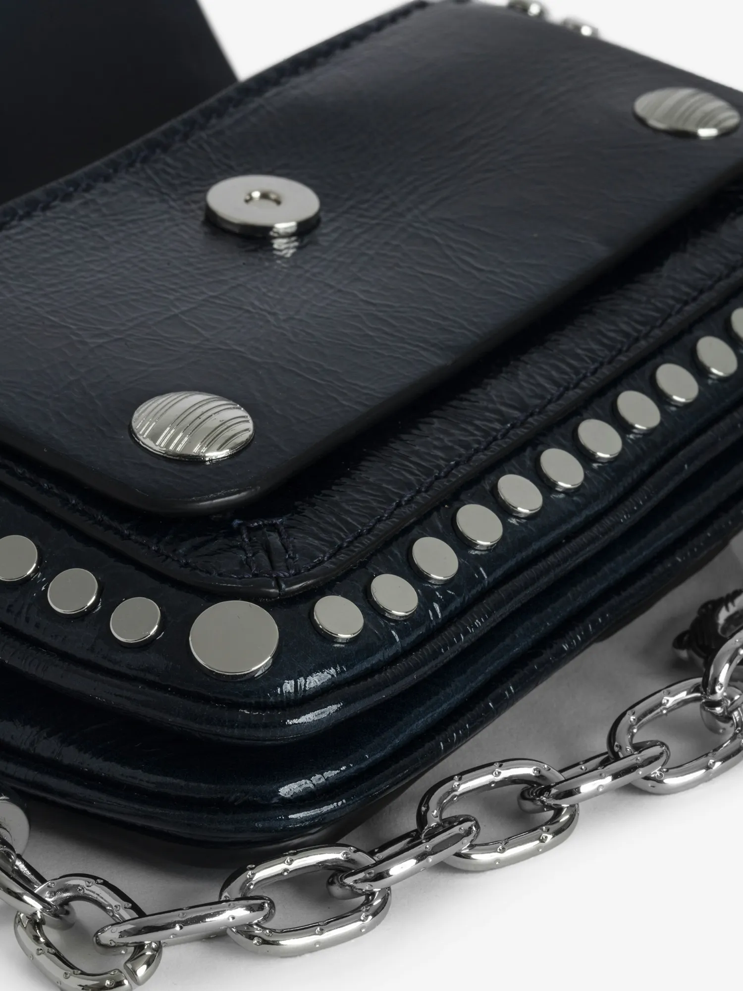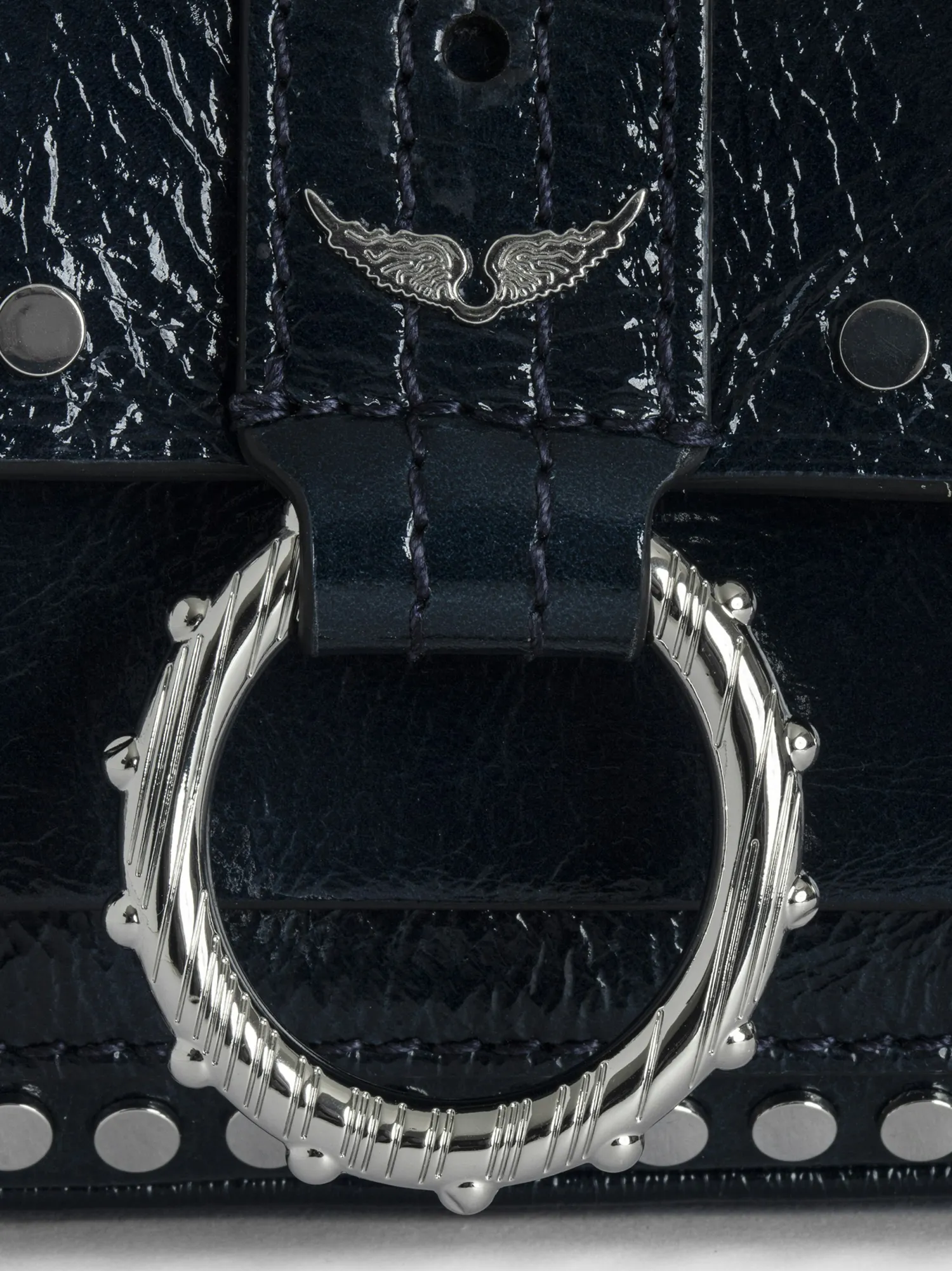 – Women’s Kate Wallet bag in glossy Ink blue leather with crinkled effect – Removable metal chain – Flap with magnetic fastening – Two compartments separated by a zipped pocket and 2 card slots – Studded details, wings and metal ring engraved with "Kate Loves Zadig&Voltaire" – Can be carried in the hand or worn on the shoulder or across the body