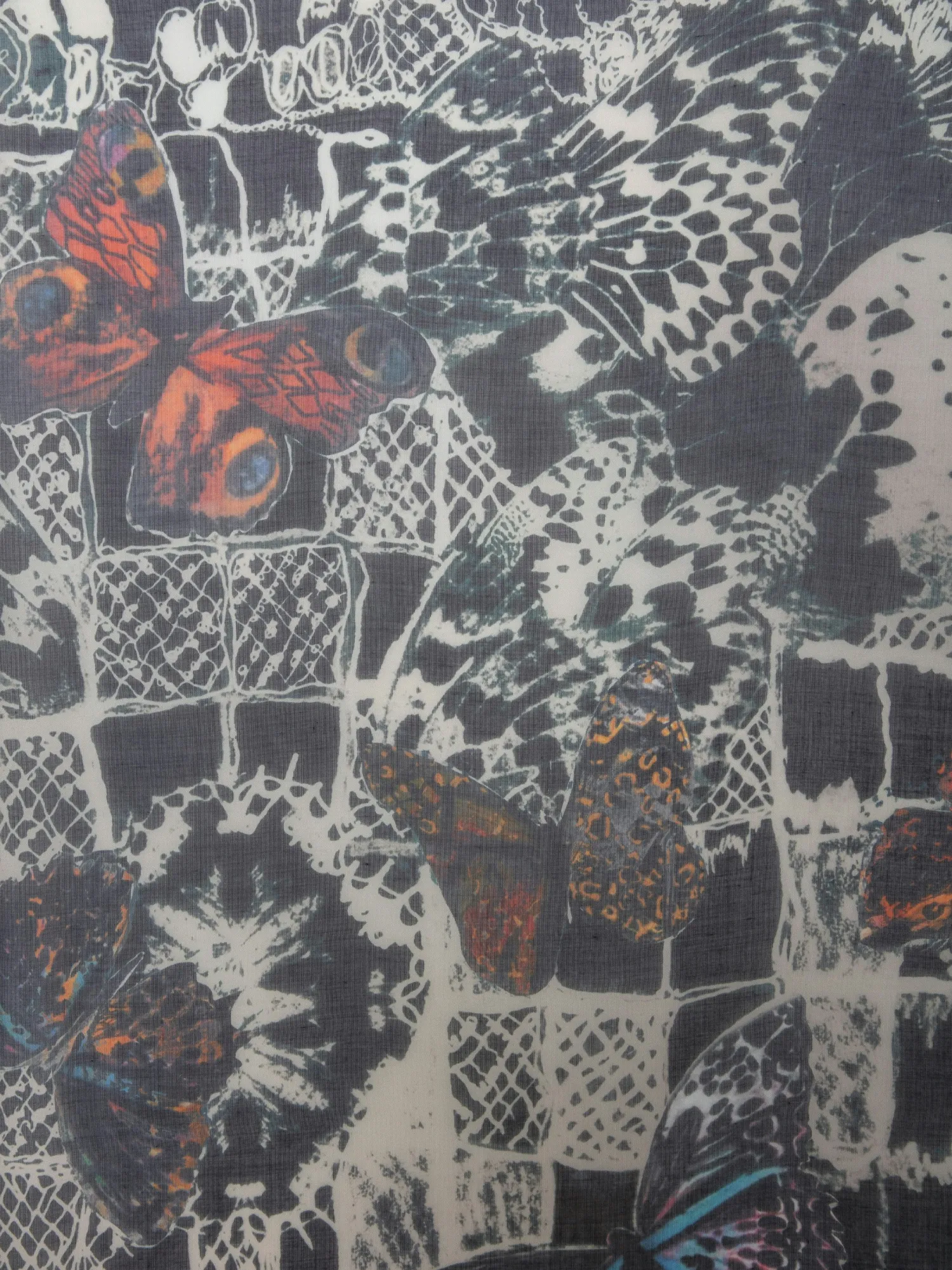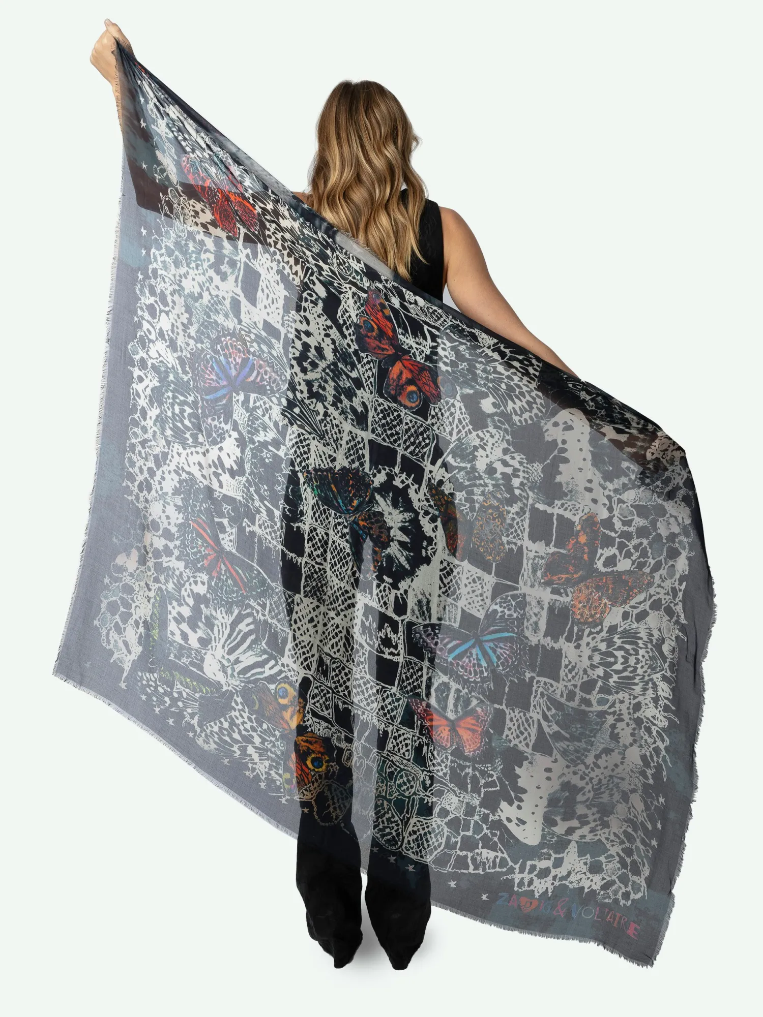 – Women’s Ink navy blue square scarf – Butterfly print and lace – Fringed edges – Made in Italy