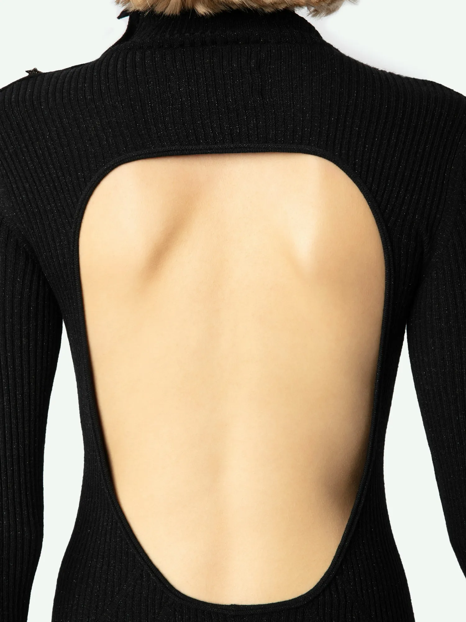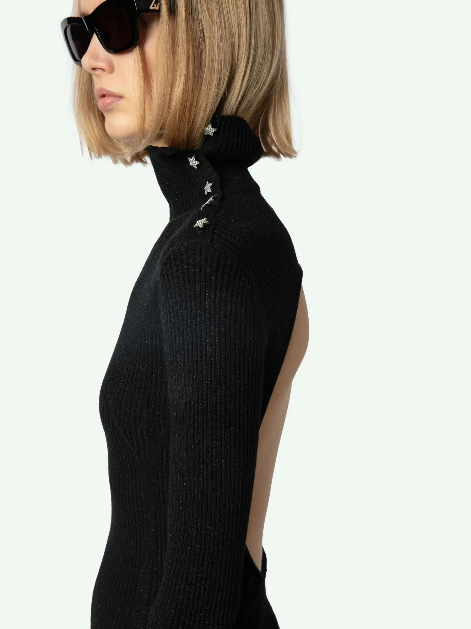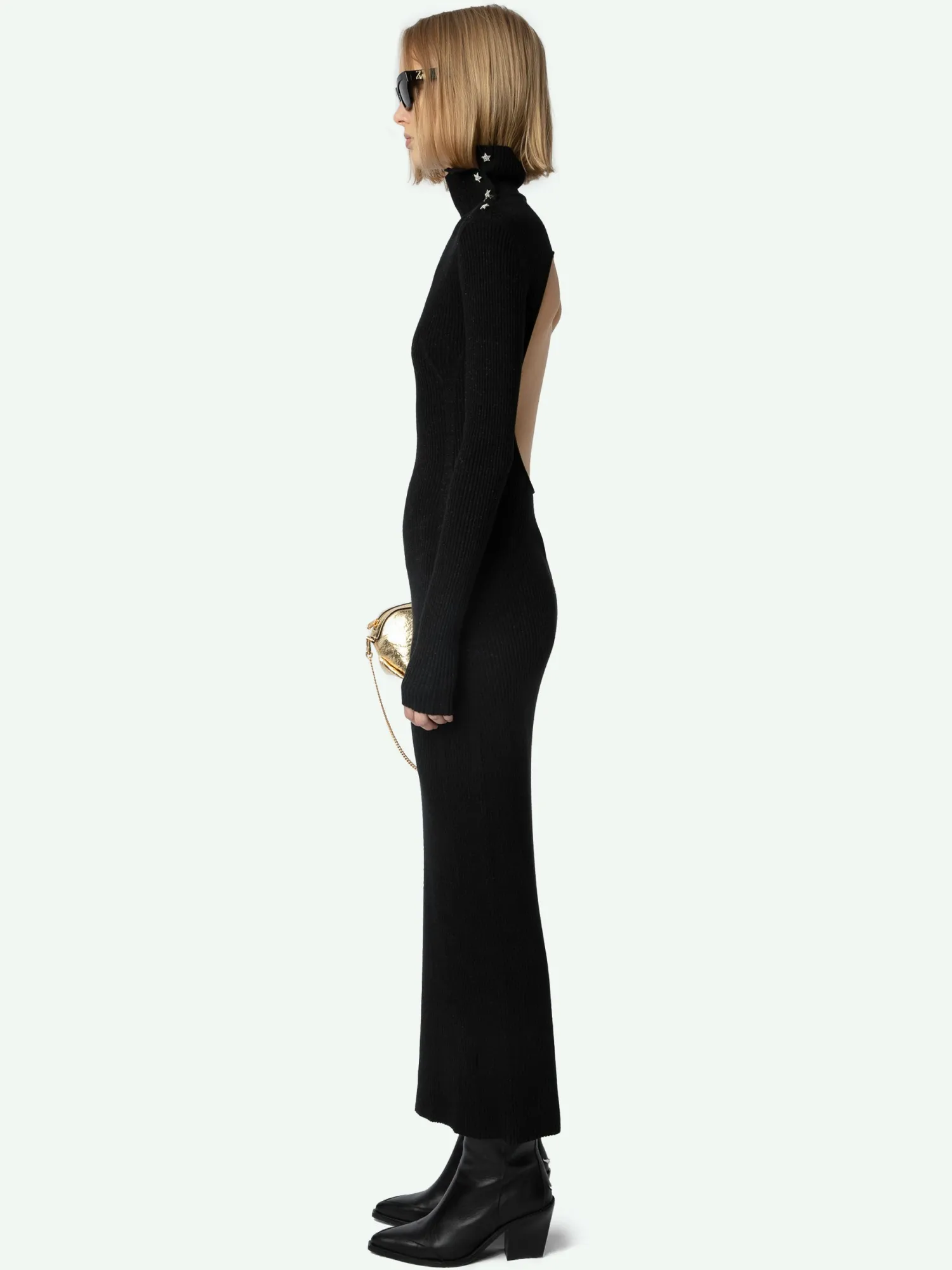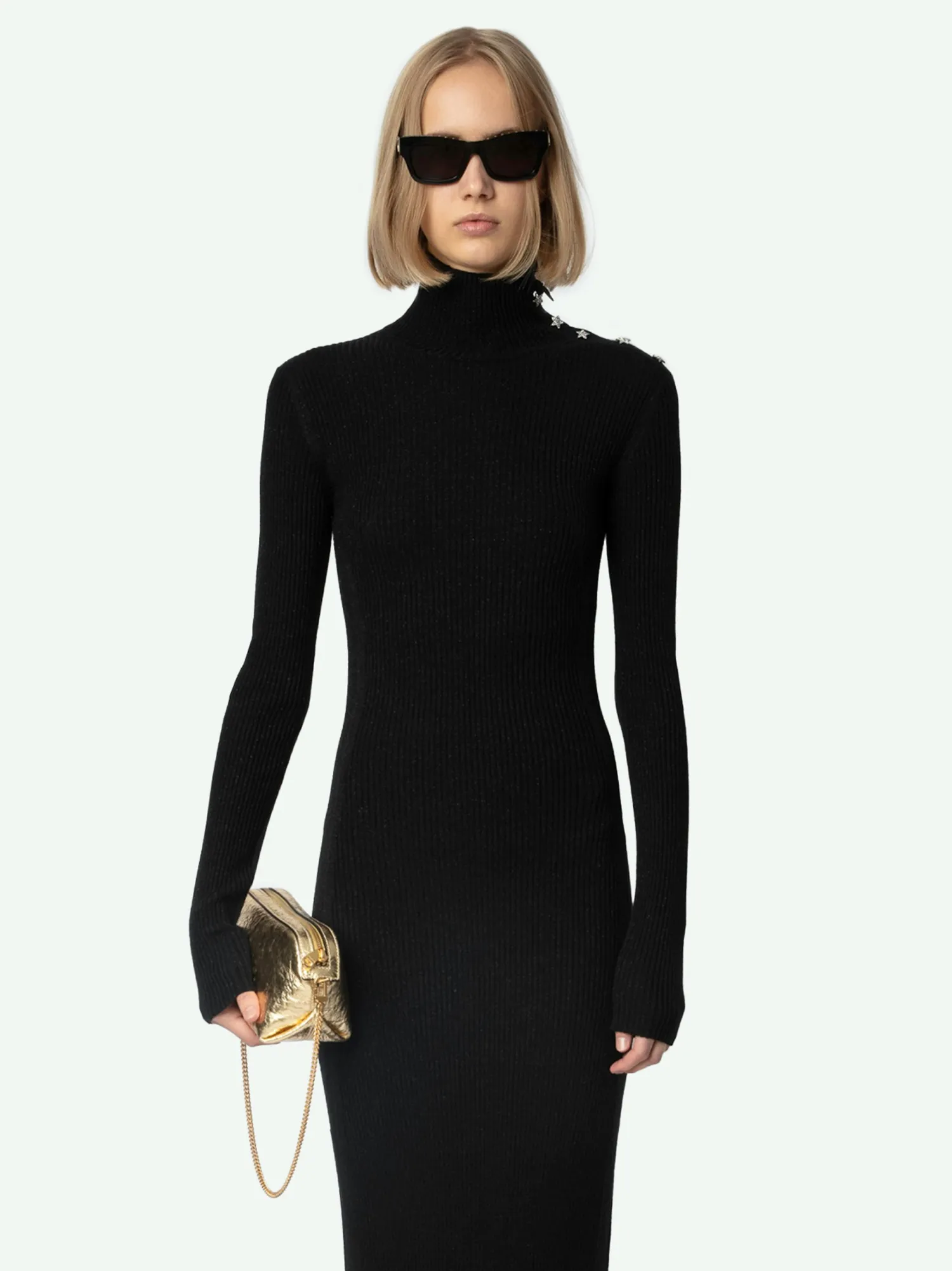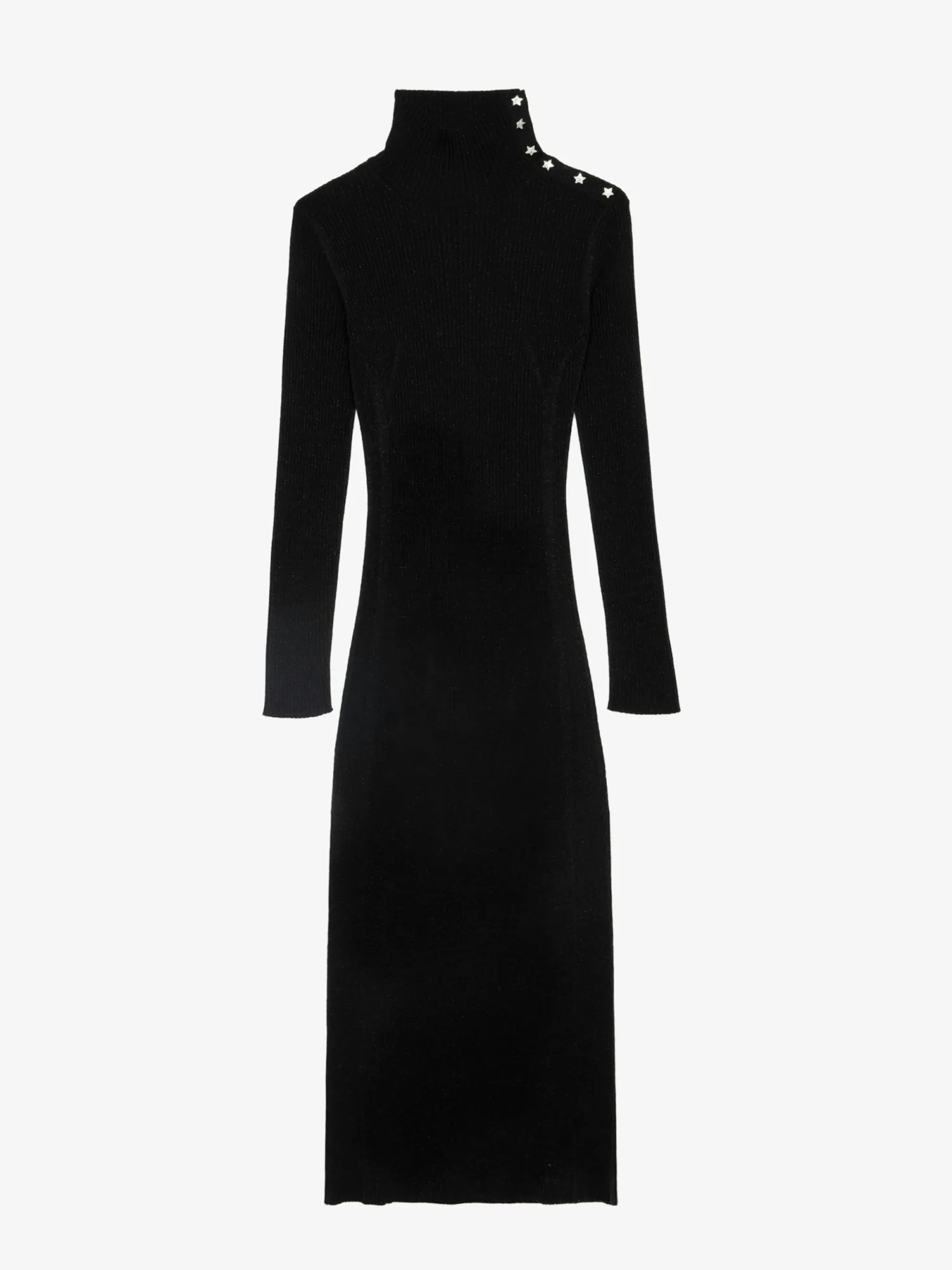 – Women’s long merino wool dress – Stand collar and diamanté star button fastening on the shoulder – Long sleeves – Seam at the back