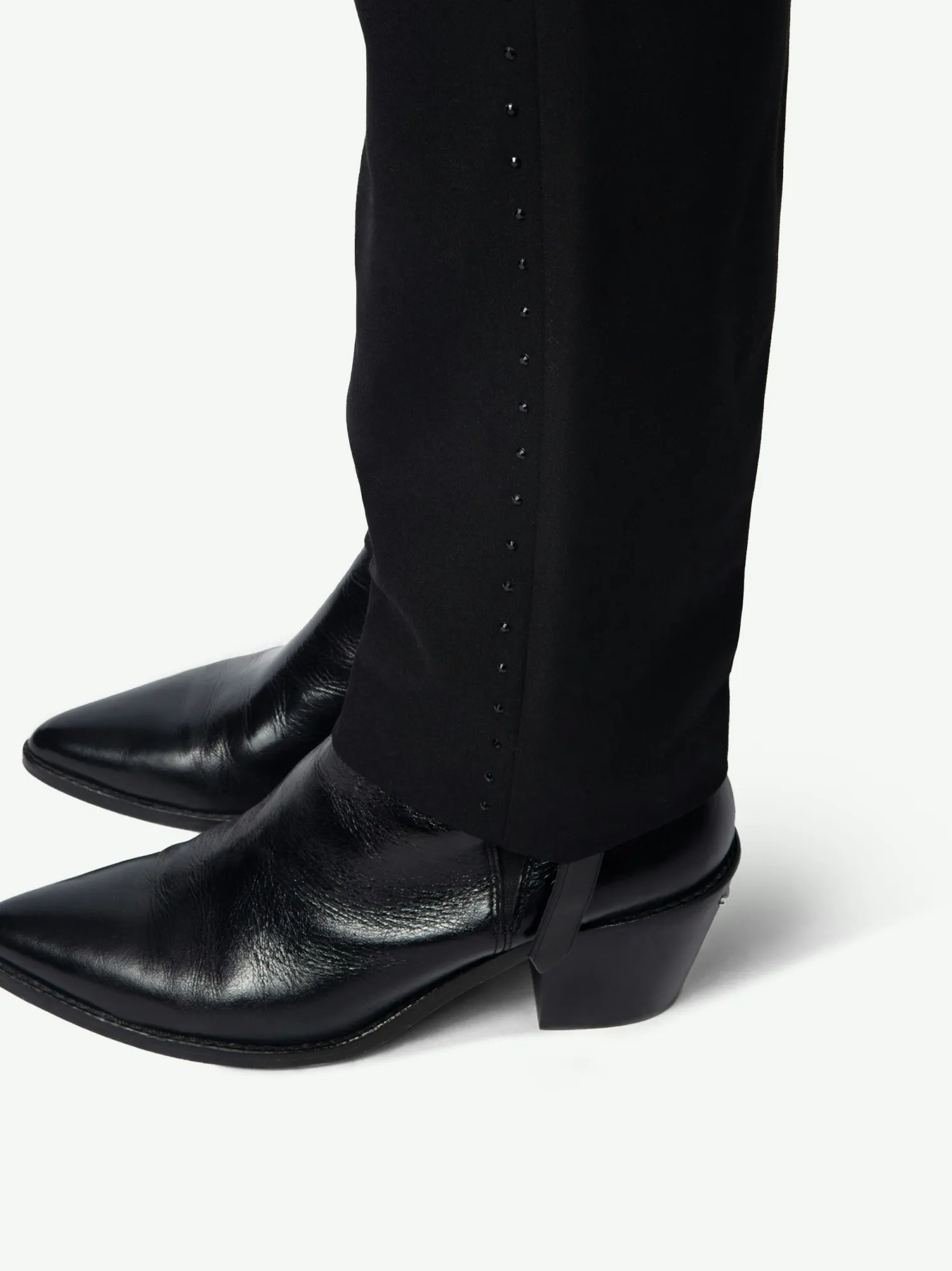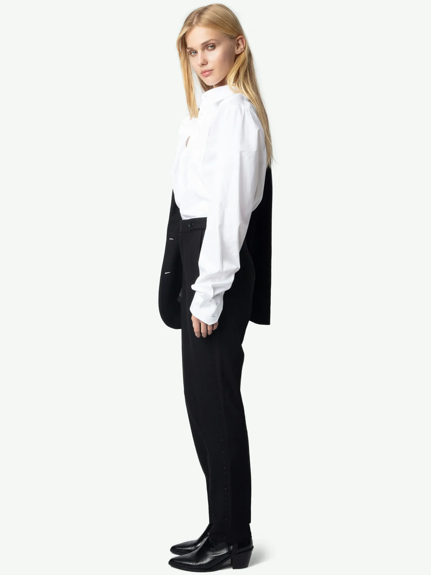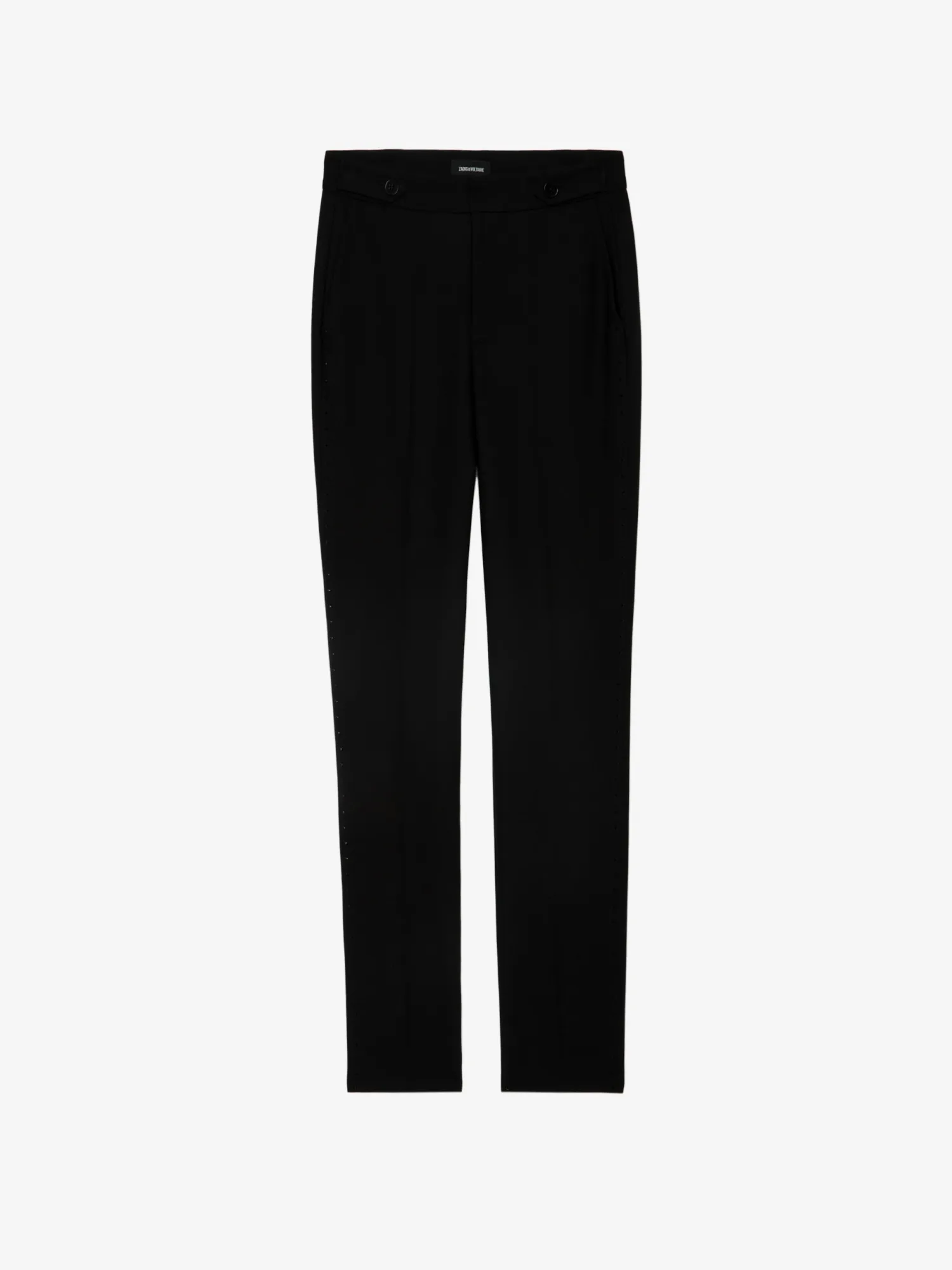 – Women’s black straight-leg suit pants – Rhinestones and pleats down the length – Zip fastening with hook and button tabs at the waist – 2 side pockets and 2 welt pockets at the back