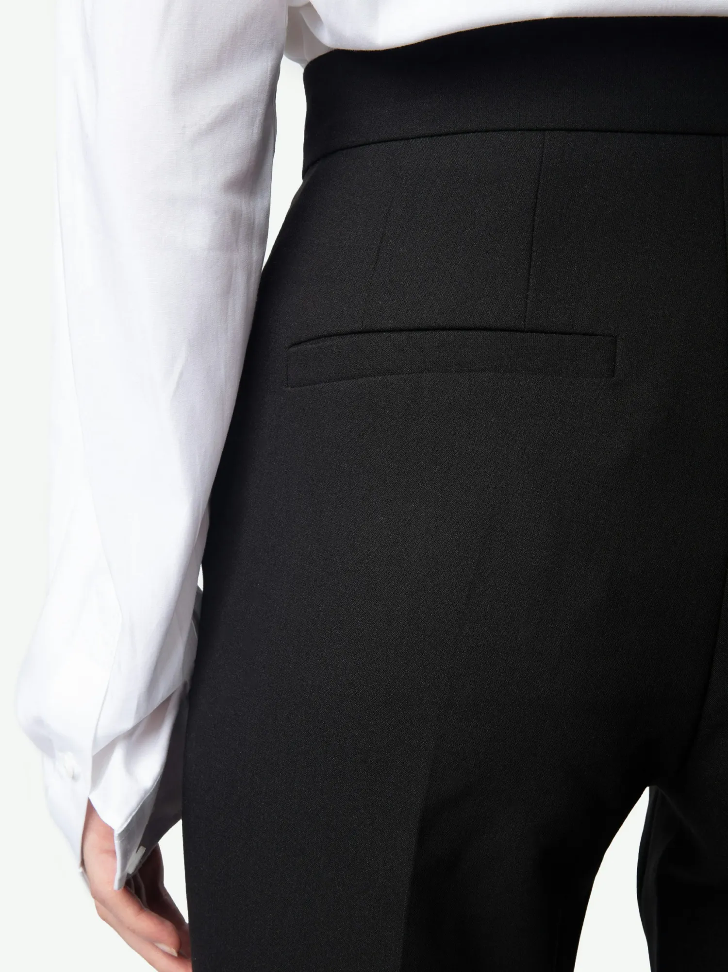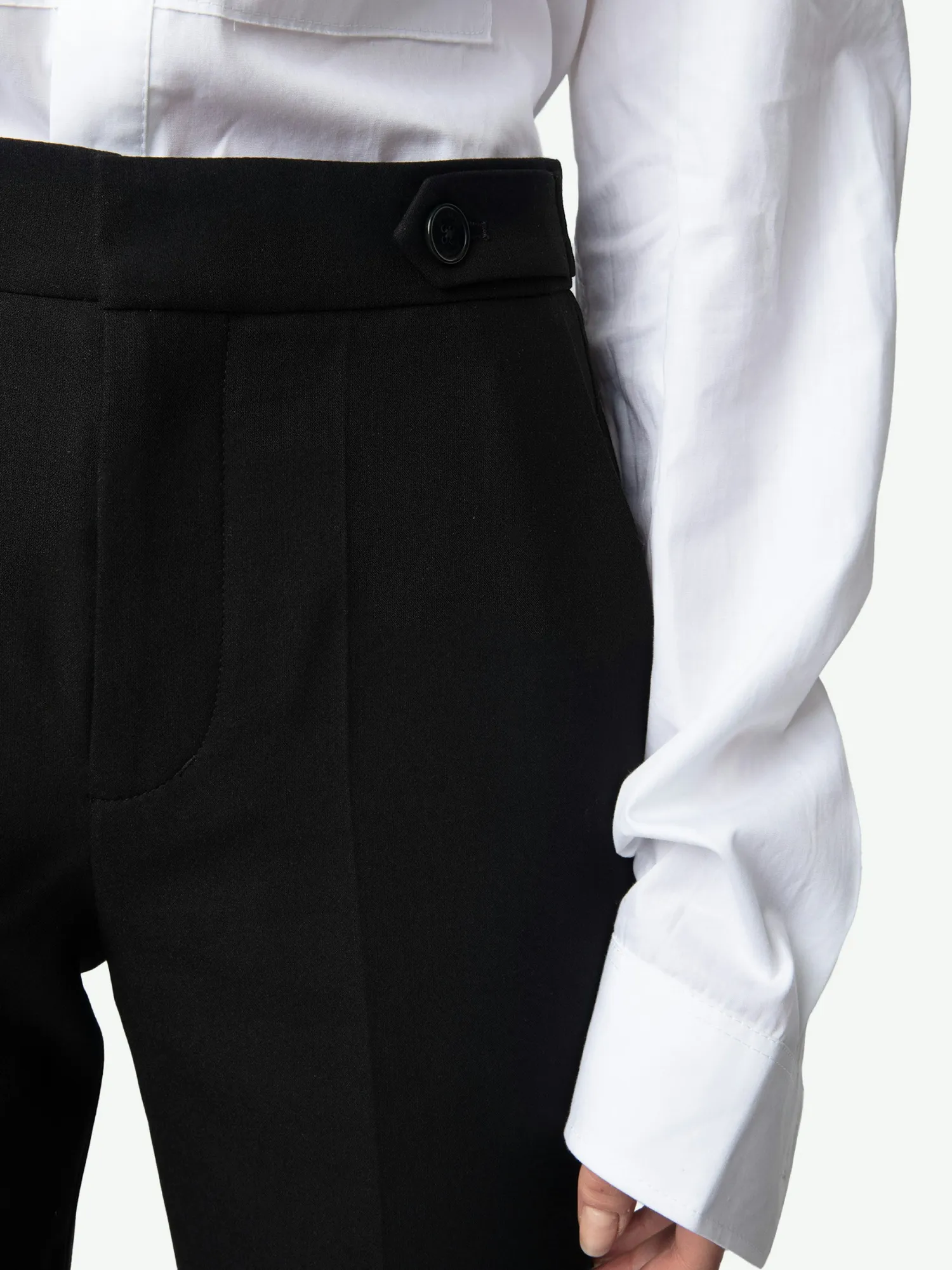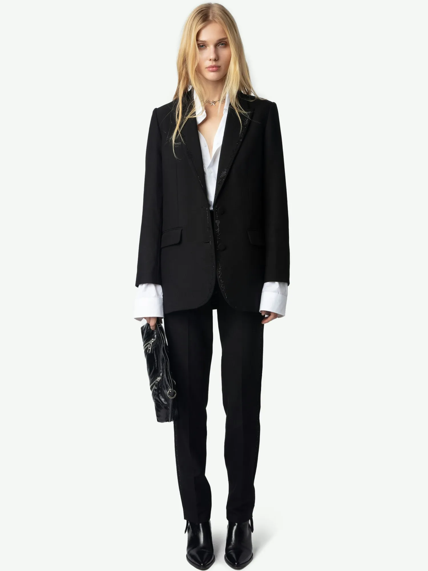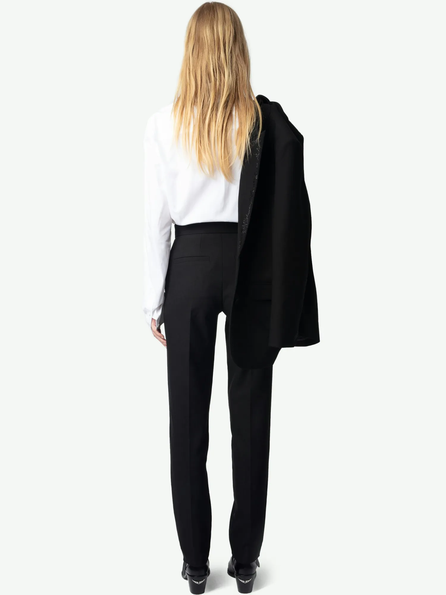– Women’s black straight-leg suit pants – Rhinestones and pleats down the length – Zip fastening with hook and button tabs at the waist – 2 side pockets and 2 welt pockets at the back