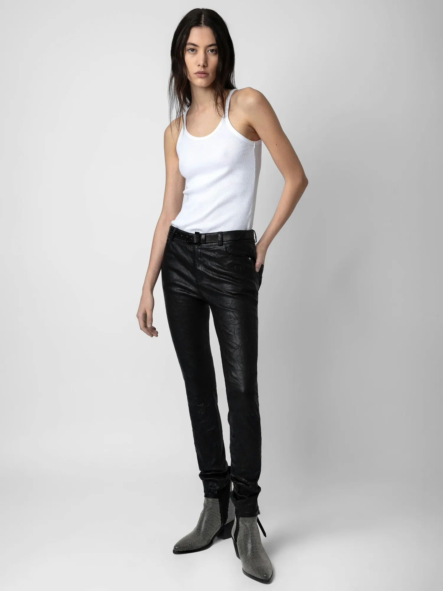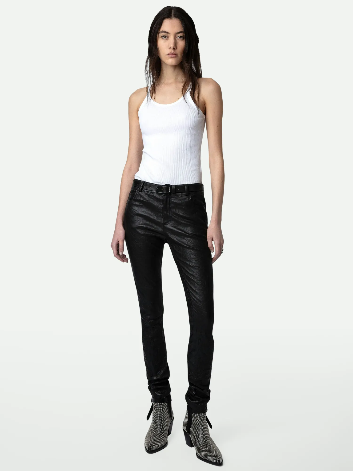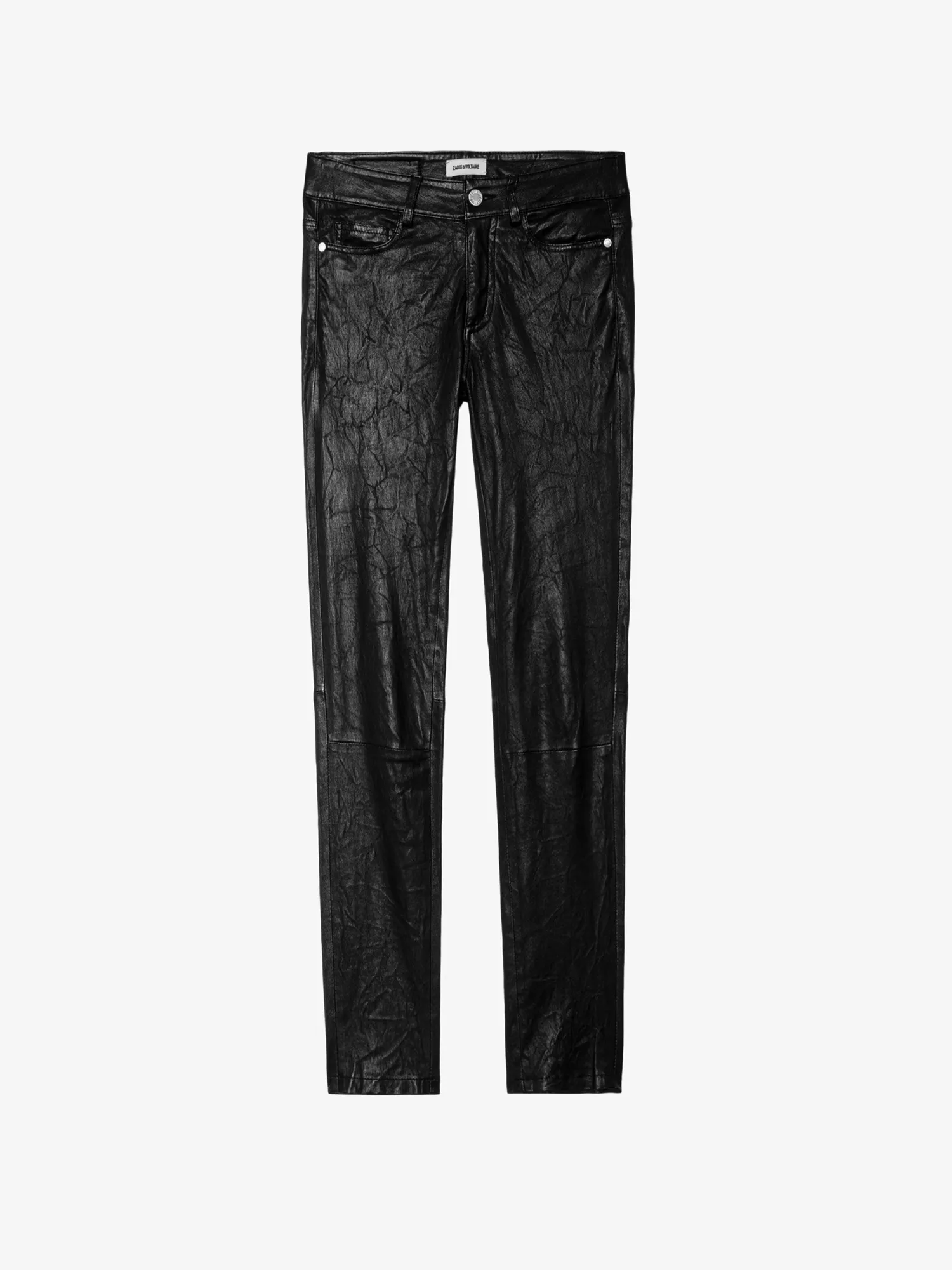 An iconic piece in the Zadig&Voltaire wardrobe, these crinkled leather pants are available in black. A must-have that works with every style. – Zadig&Voltaire Women’s pants in black crinkled leather – Button and zip closure – Belt loops at the waist – 5 pockets – Zadig&Voltaire’s signature material, crinkled leather, is obtained by means of a multi-step process developed by the Maison, guaranteeing a unique product that incorporates exceptional know-how