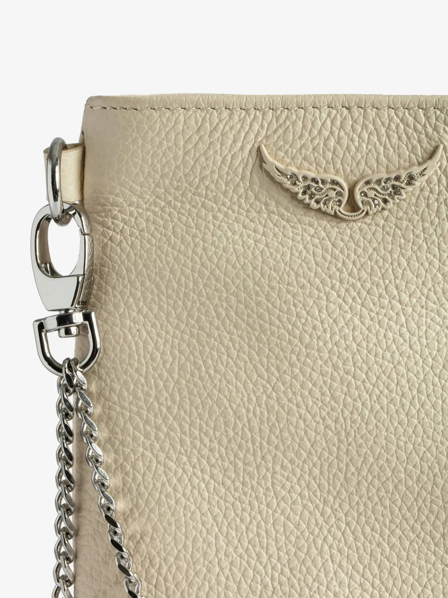 – Women’s Flash ecru grained leather phone pouch – Shoulder strap with removable double metal chains – 3 card slots on inside and one zipped pocket on outside at back – Tone-on-tone wings with silver diamanté