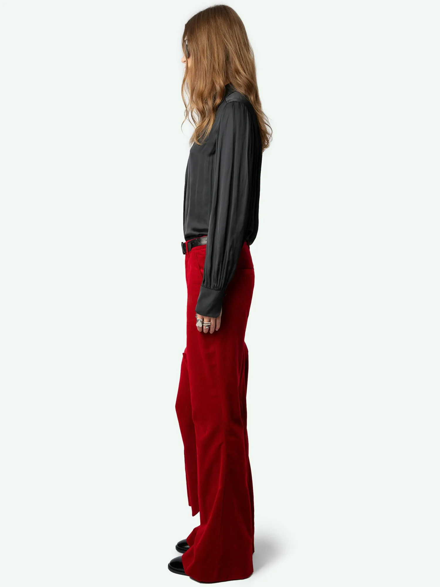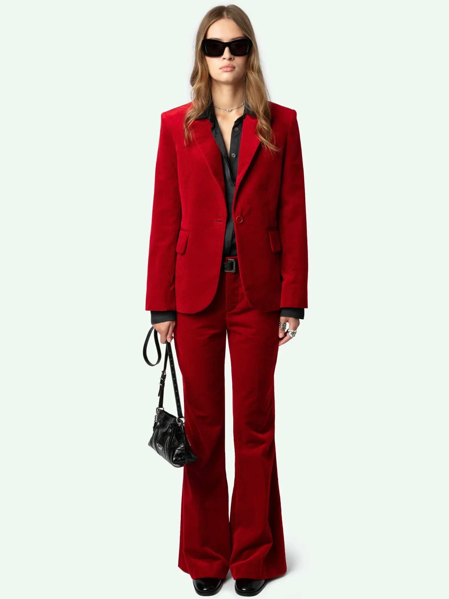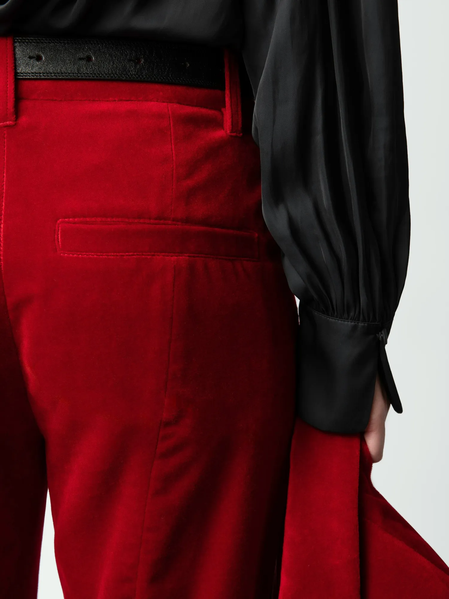 – Women’s velvet flared pants in Velvet red – Mid-rise waist – Zip and hook fastening and belt loops – 2 side pockets and 2 welt pockets on the back – Flared hems