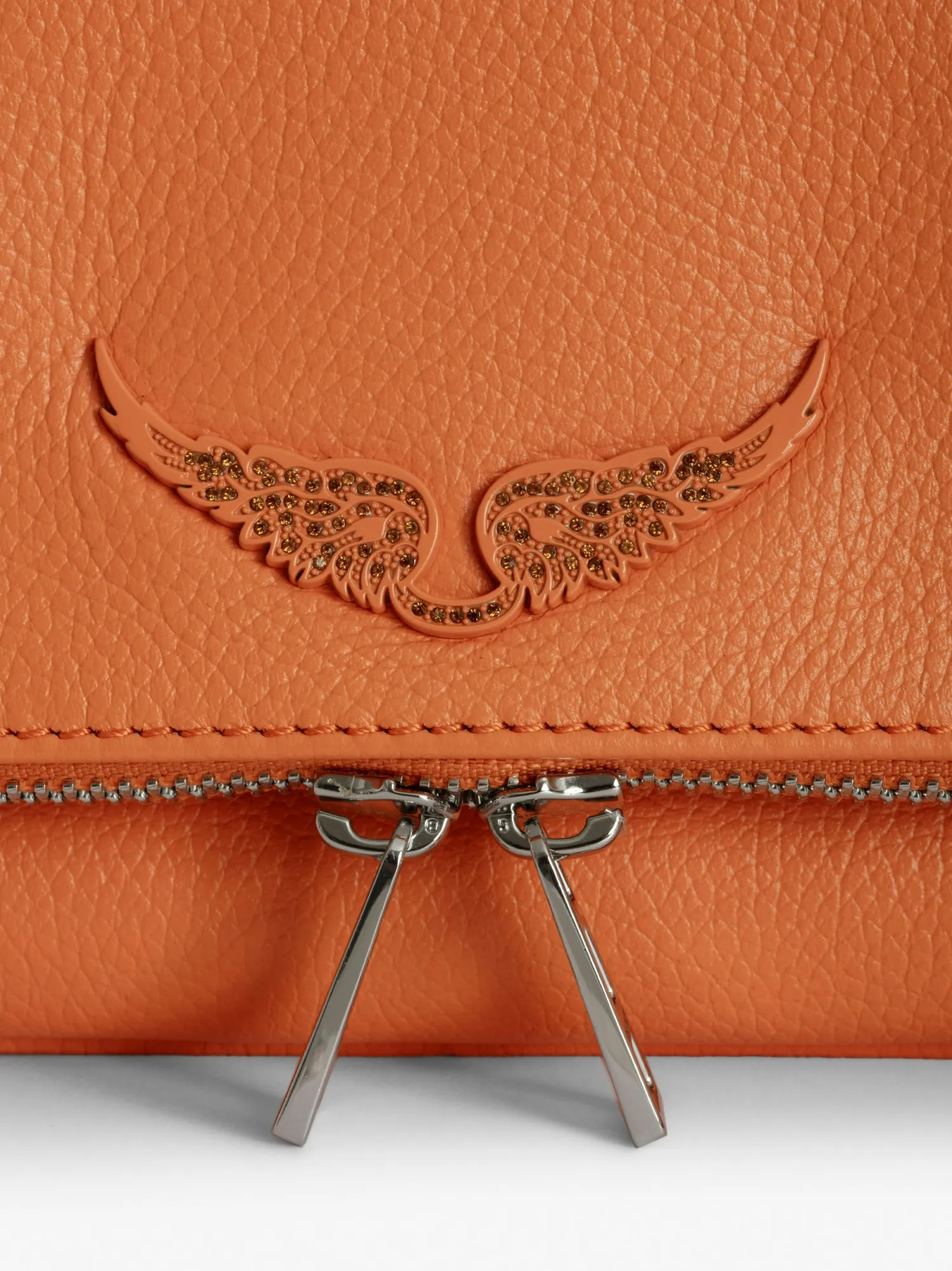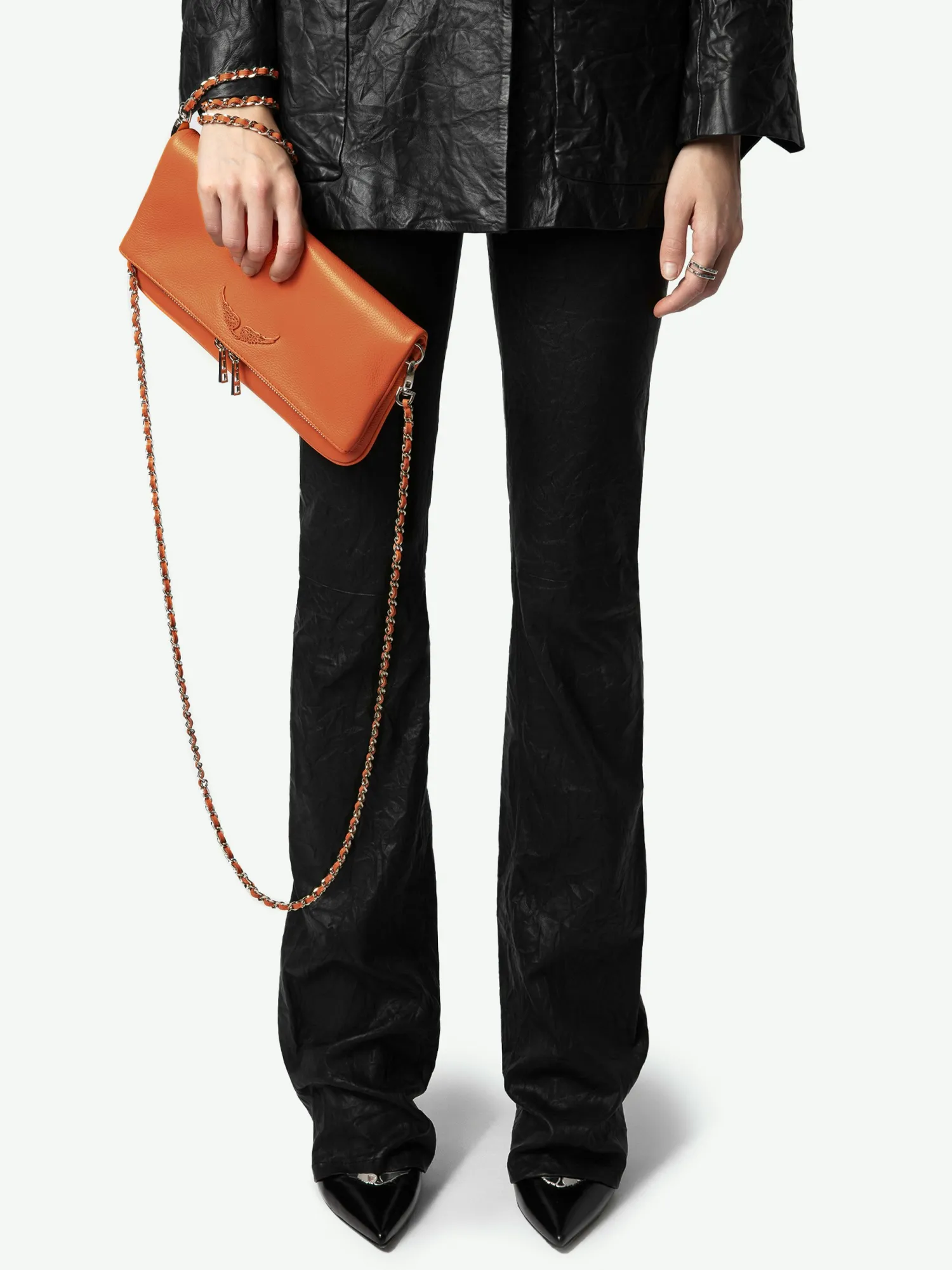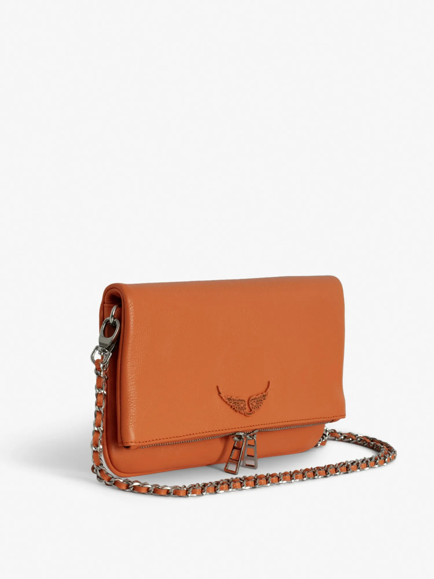 – Women’s Rock clutch in Vibe orange grained leather – Two removable intertwined leather and metal chains – Flap with magnetic zip fastening – Small zipped pocket on the back and small patch pocket inside – Lined – Wings embellished with tone-on-tone diamante – Can be carried in the hand or worn on the shoulder or across the body