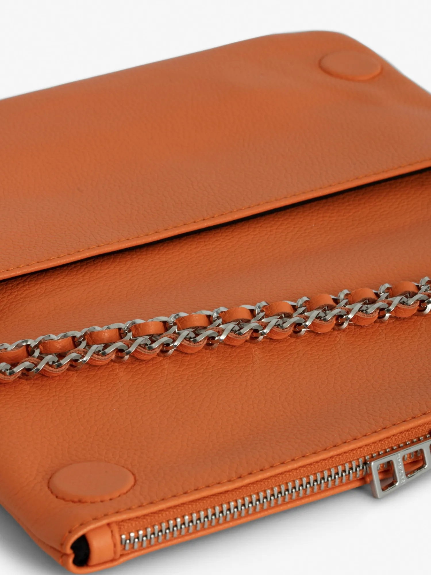 – Women’s Rock clutch in Vibe orange grained leather – Two removable intertwined leather and metal chains – Flap with …