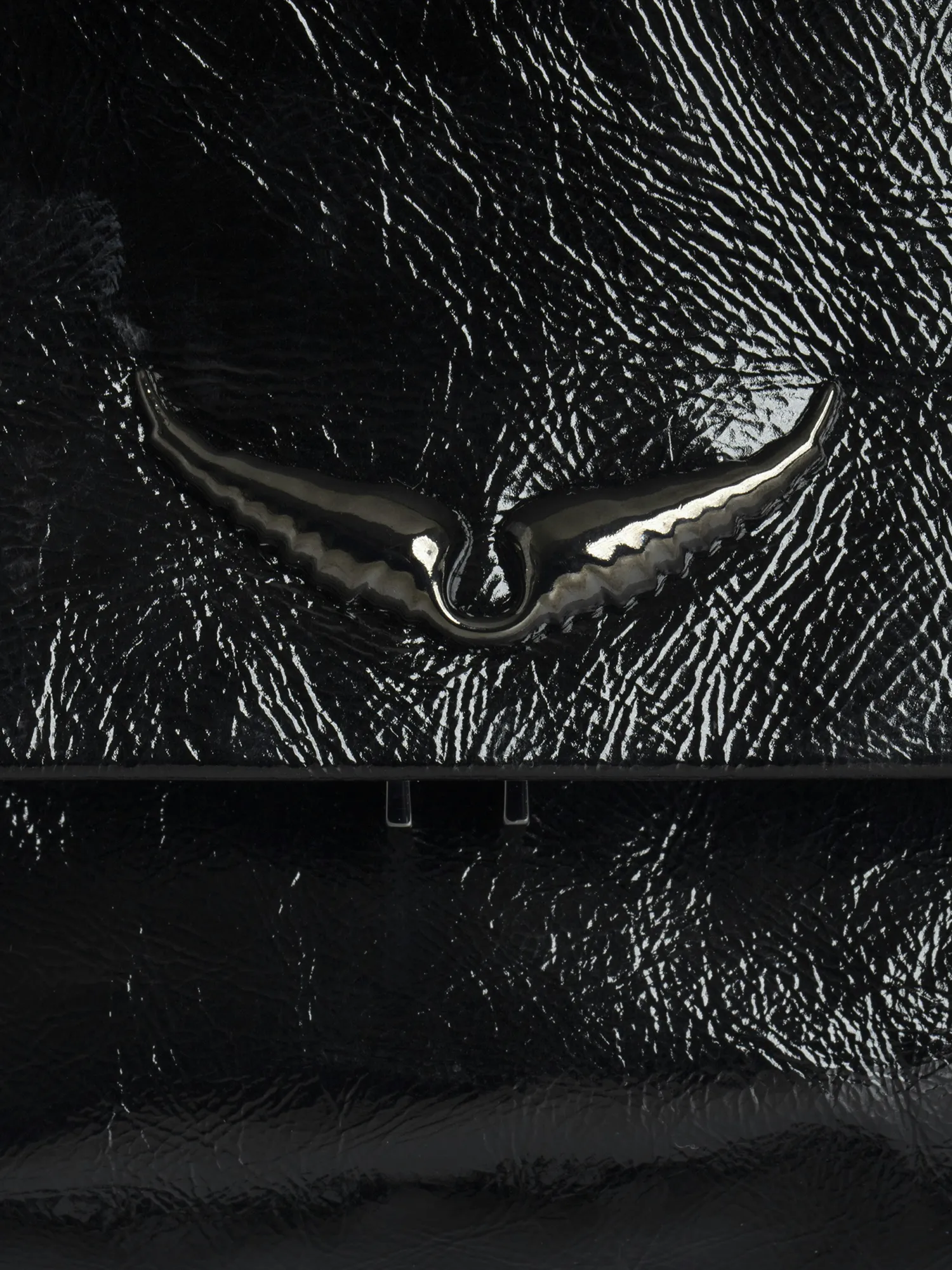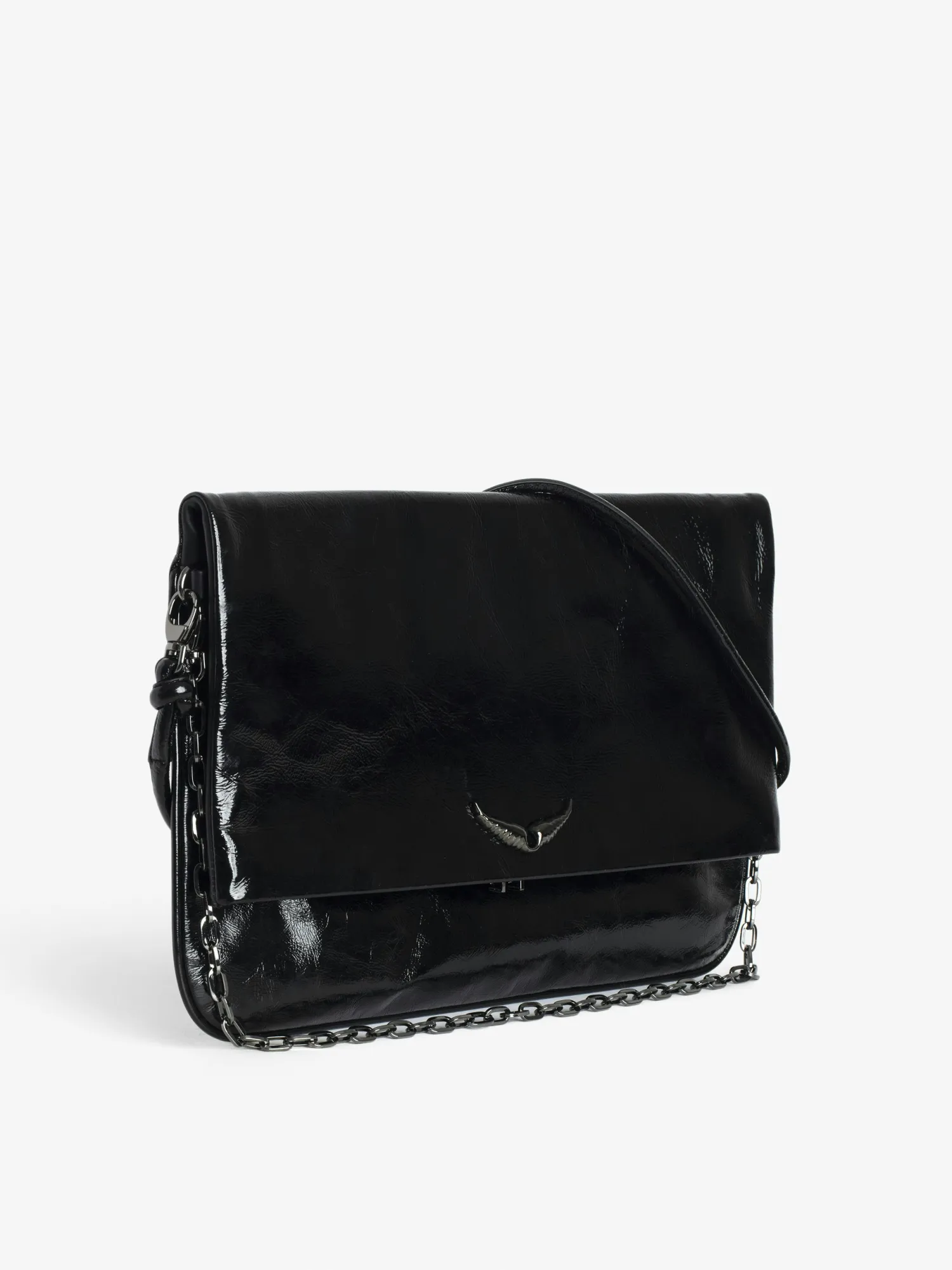 – Women’s Rock XL black smooth leather clutch – Two removable shoulder straps, one chain and one tied in leather – Metal mirror wings – Flap with zip and magnetic closure – Zip pocket on the back – Carry by hand, over the shoulder or across the body Width x Height: 15 x 8 in. Chain height: 18 in. Shoulder strap height: 11 in.