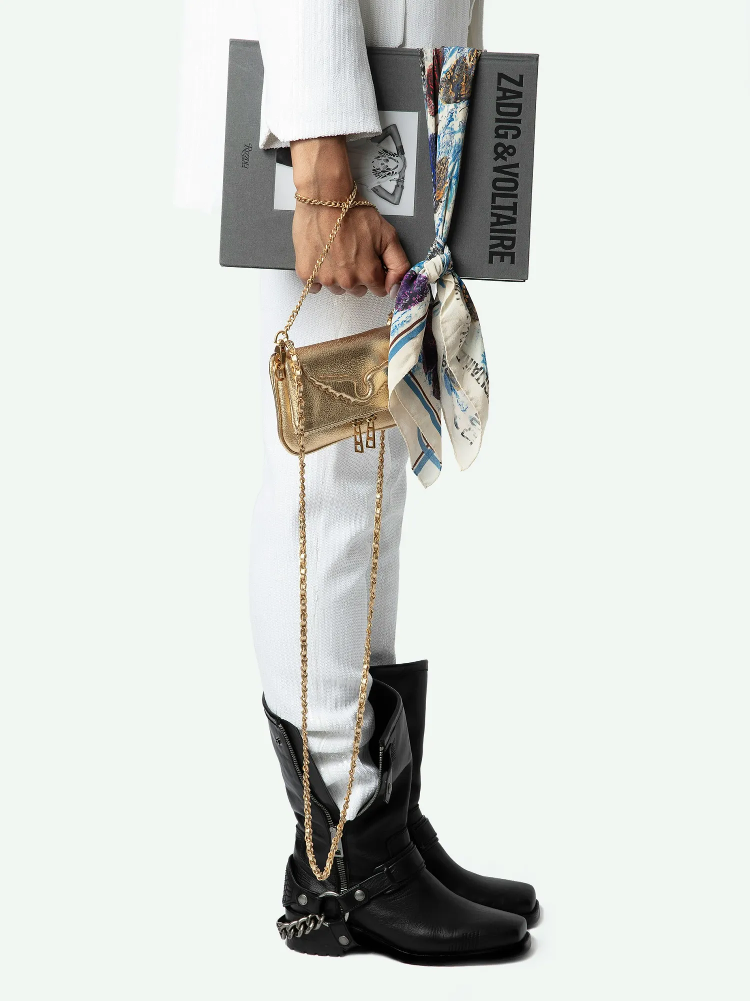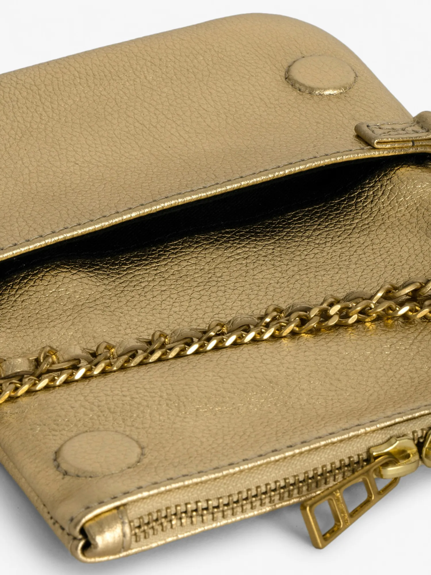 – Women’s Gold metallic grained leather Rock Nano clutch – Two removable chains, one interlaced with leather and the oth…