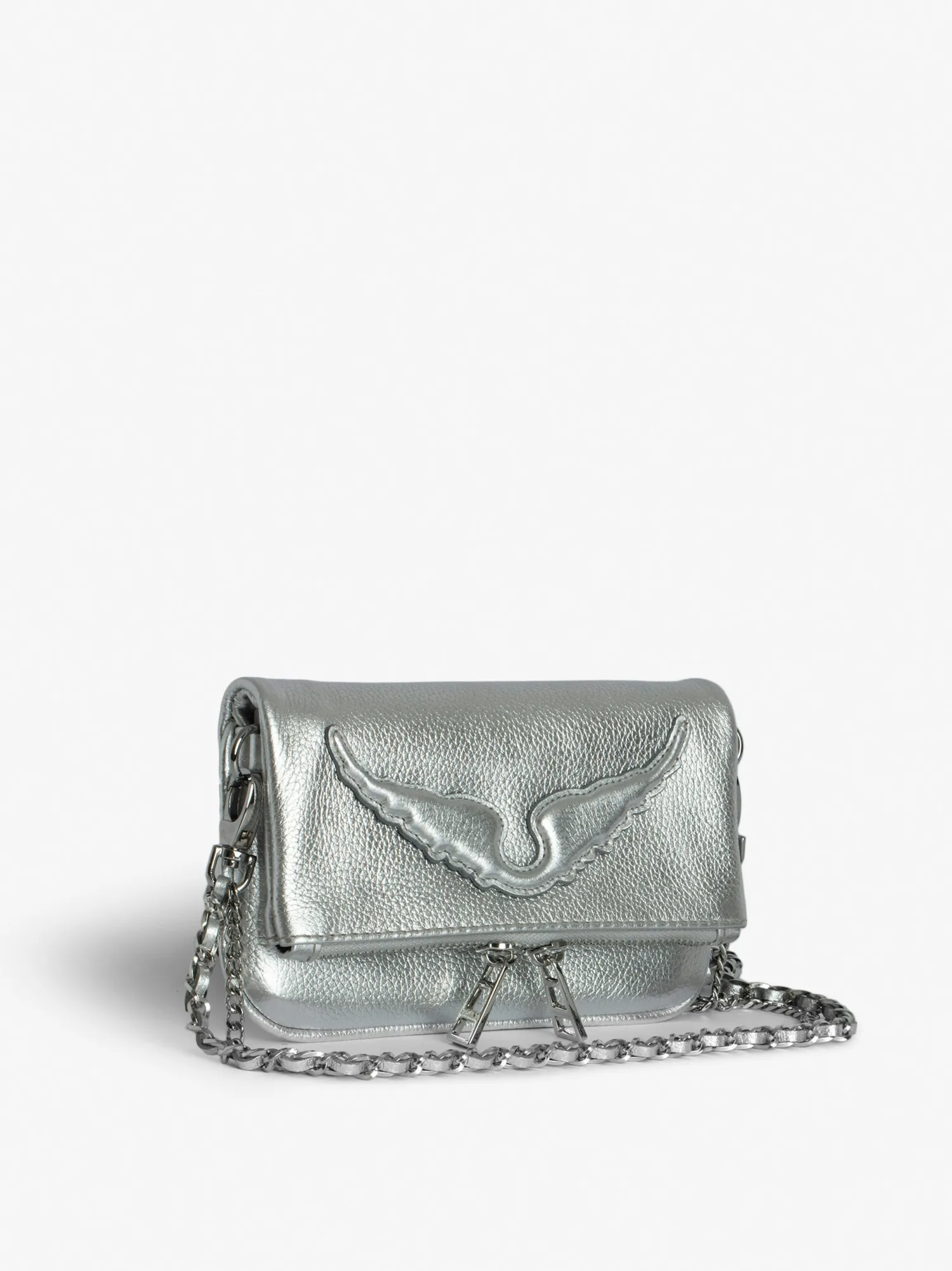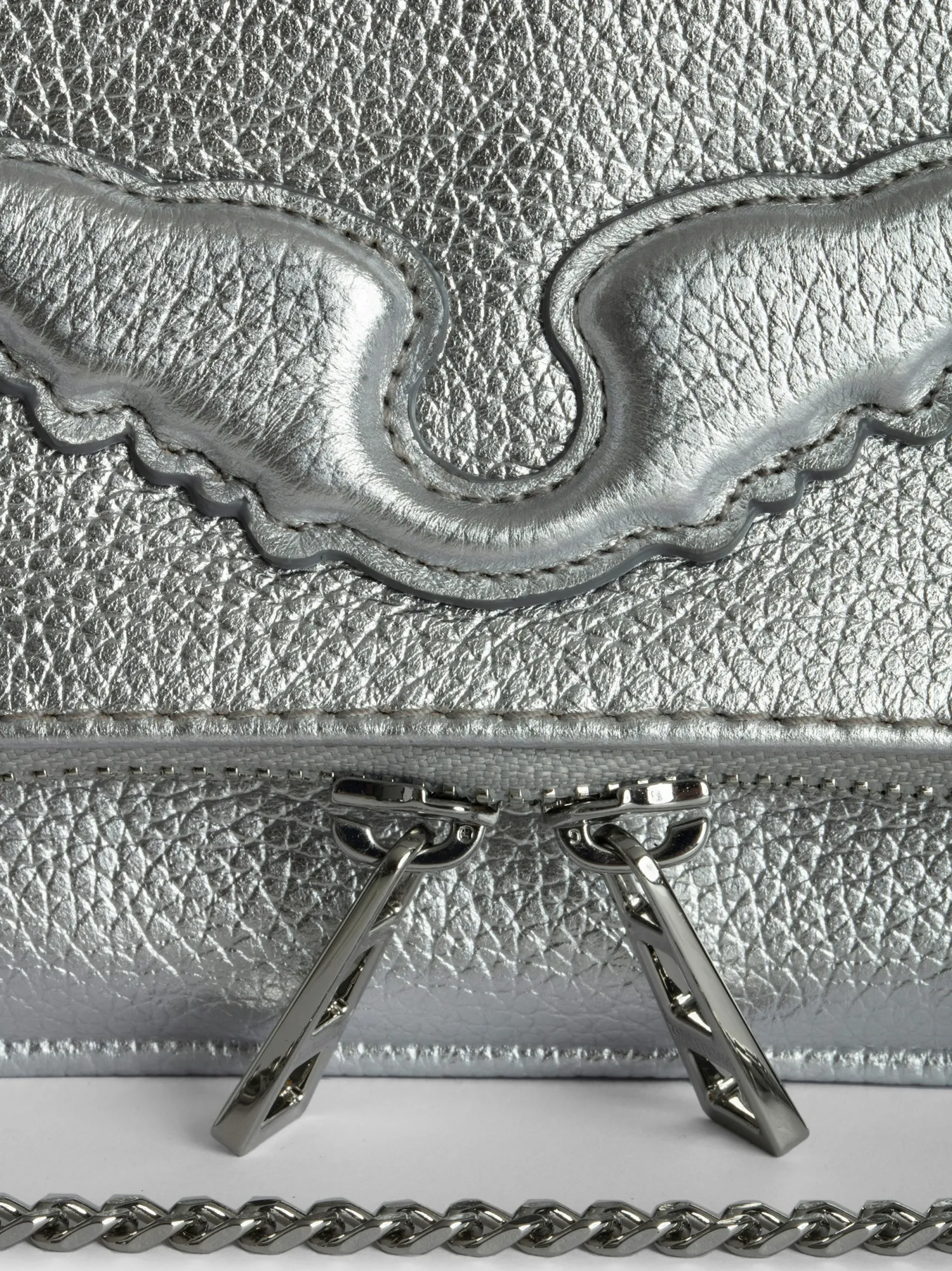 – Women’s Silver metallic grained leather Rock Nano clutch – Two removable chains, one interlaced with leather and the other in metal – Flap with magnetic fastening – Zipped pockets at the back and inside the flap – Lined – Tone-on-tone embossed wings – Can be carried in the hand or worn on the shoulder or across the body