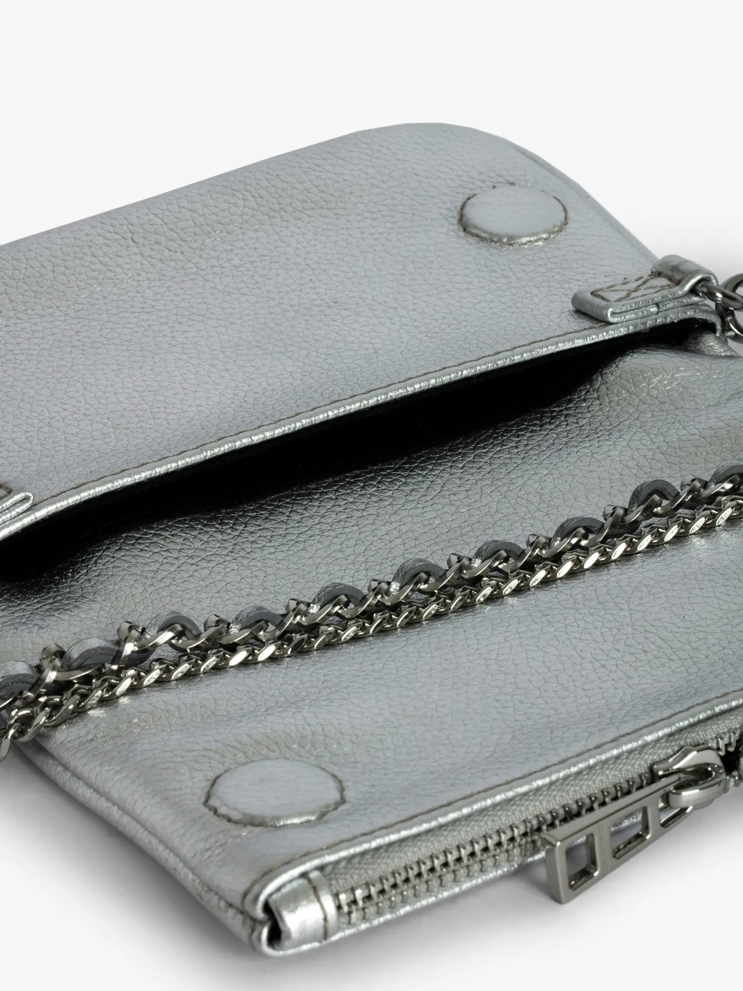 – Women’s Silver metallic grained leather Rock Nano clutch – Two removable chains, one interlaced with leather and the o…