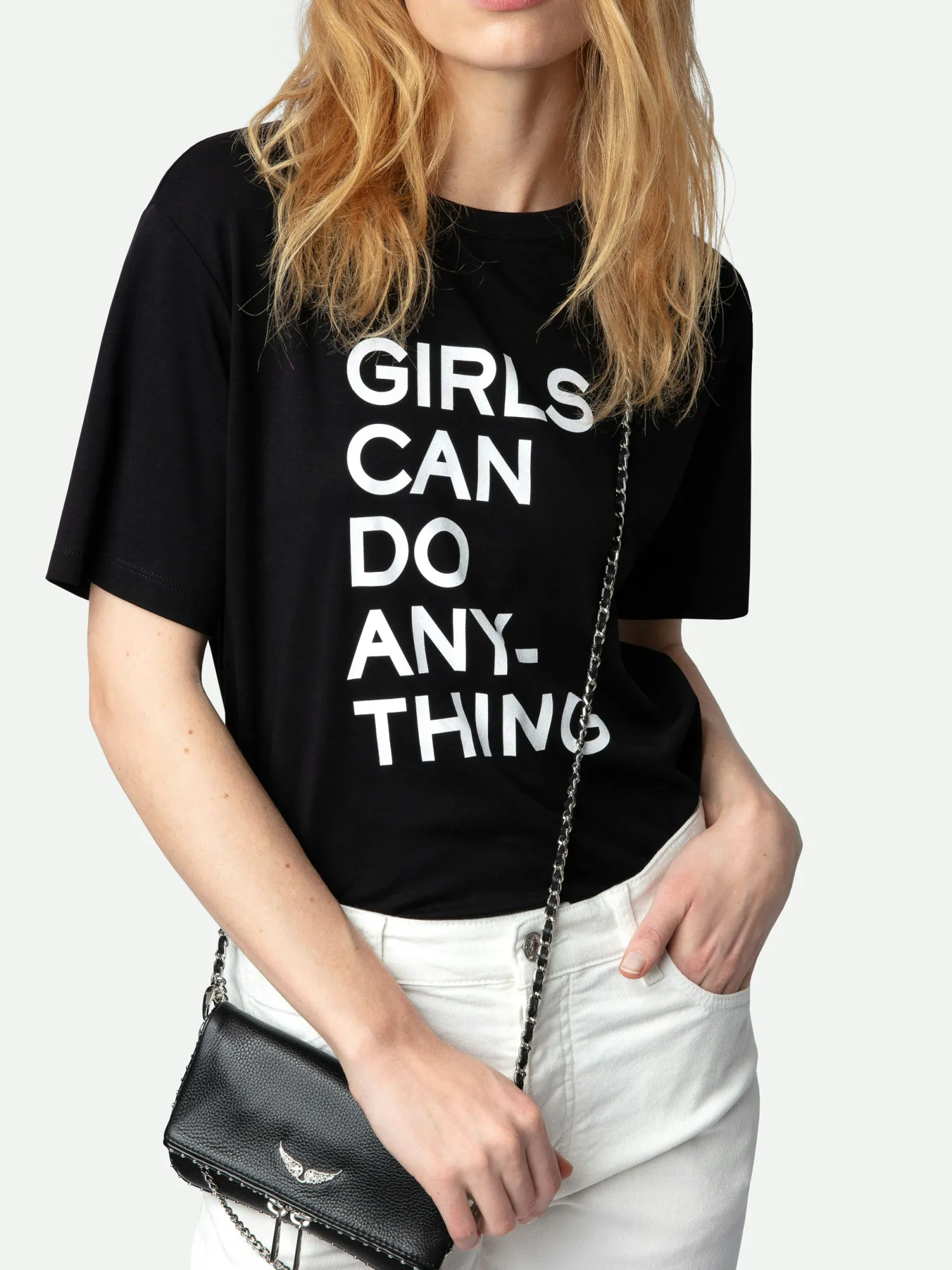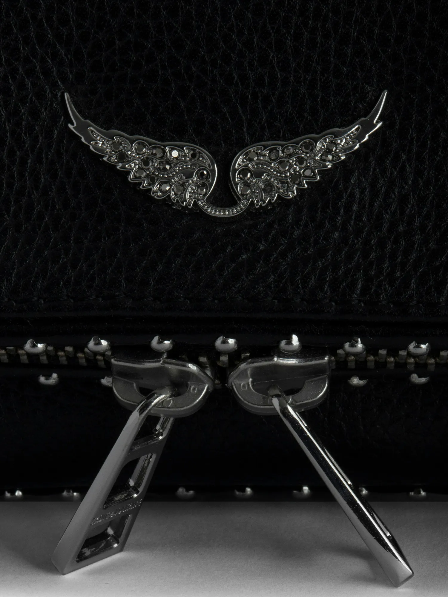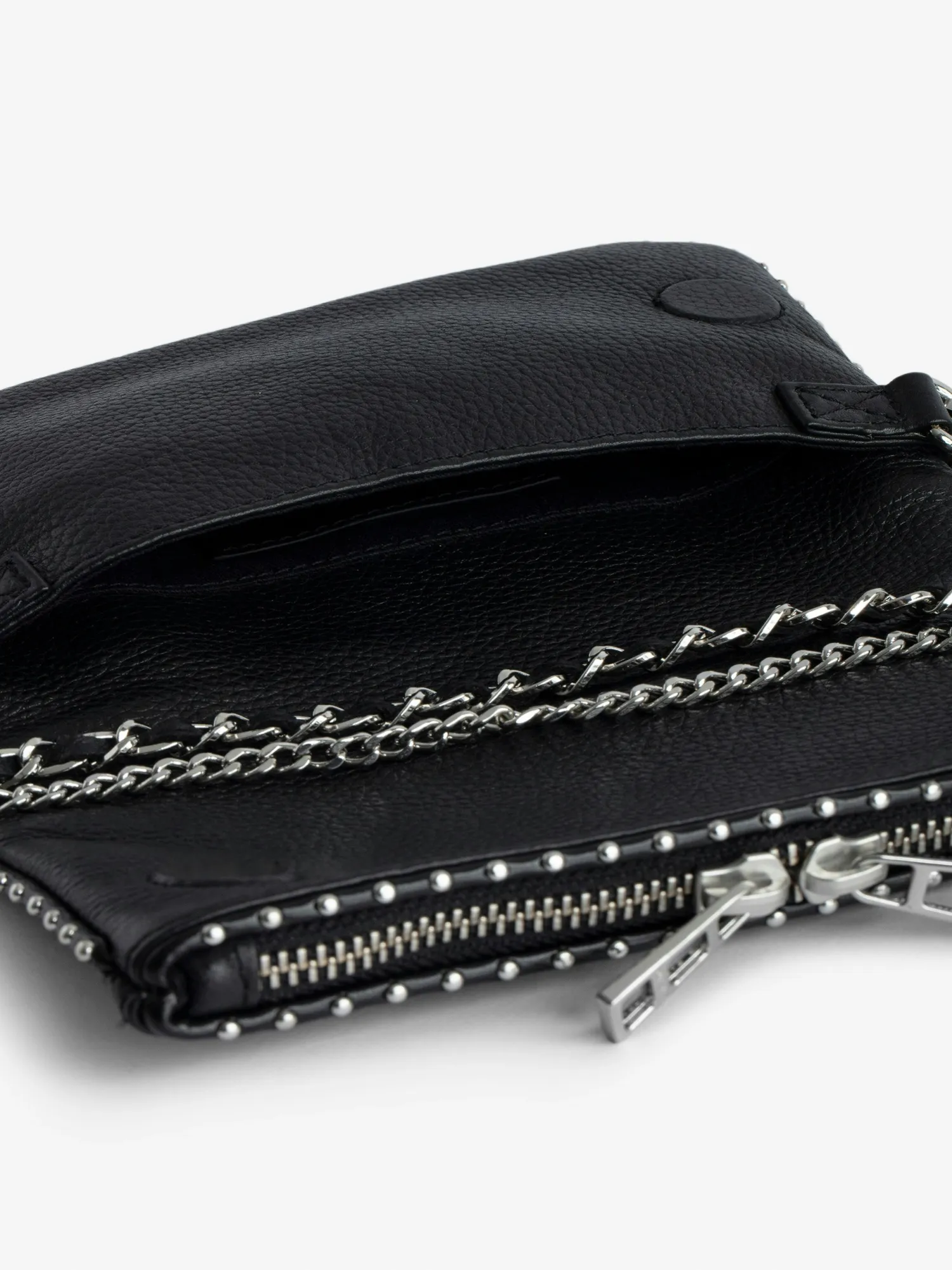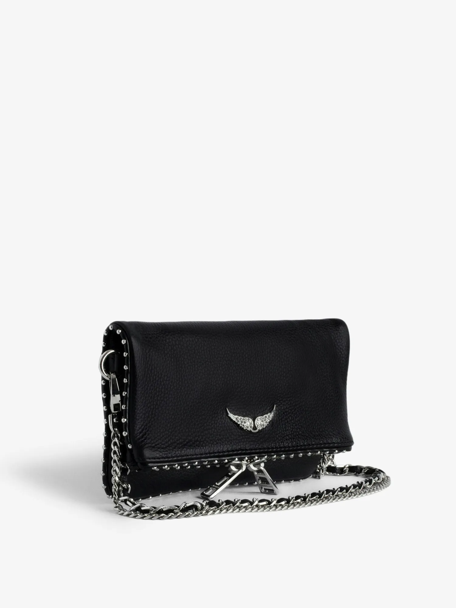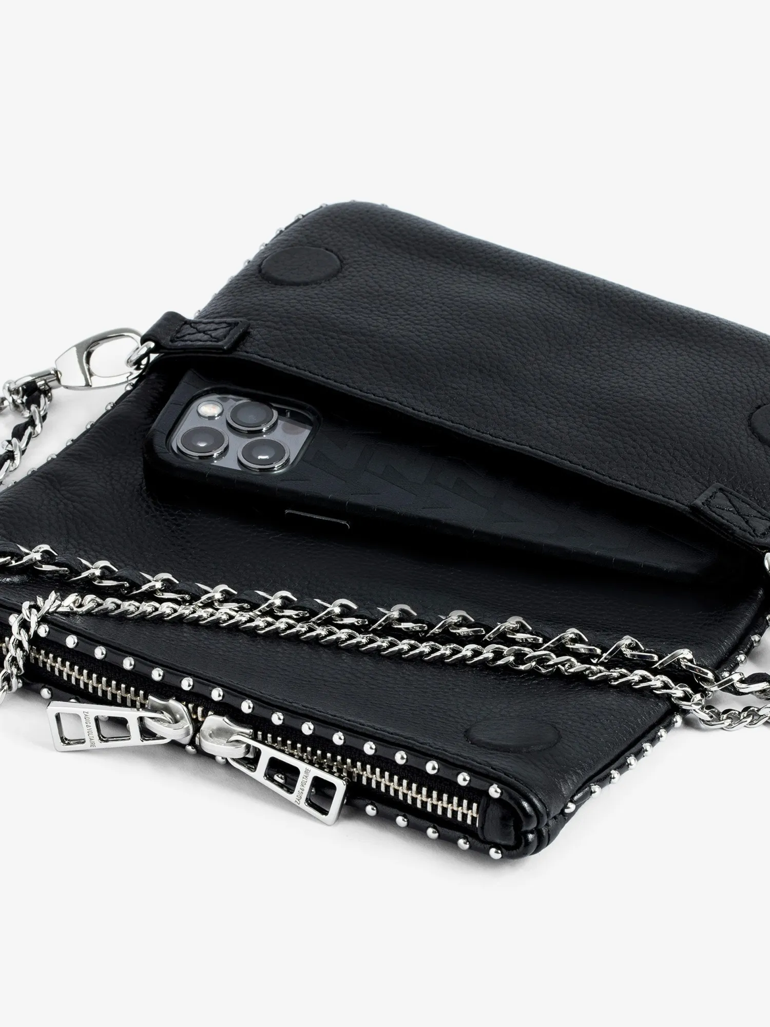 A nano version of the iconic Rock clutch, for carrying just the essentials. Carry your studded mini clutch in your hands or wear across the body; this bag is essential for days and evenings. This leather version is embellished with crystal-set wings, as well as a double chain woven with leather, allowing you to wear it across the body or on the shoulder. – Zadig&Voltaire Women’s Rock Nano mini clutch in black leather with silver-toned studs – Flap with magnetic closure – Removable leather and metal chain – Mini clutch comes with a zipped back pocket – Rhinestone wings charm