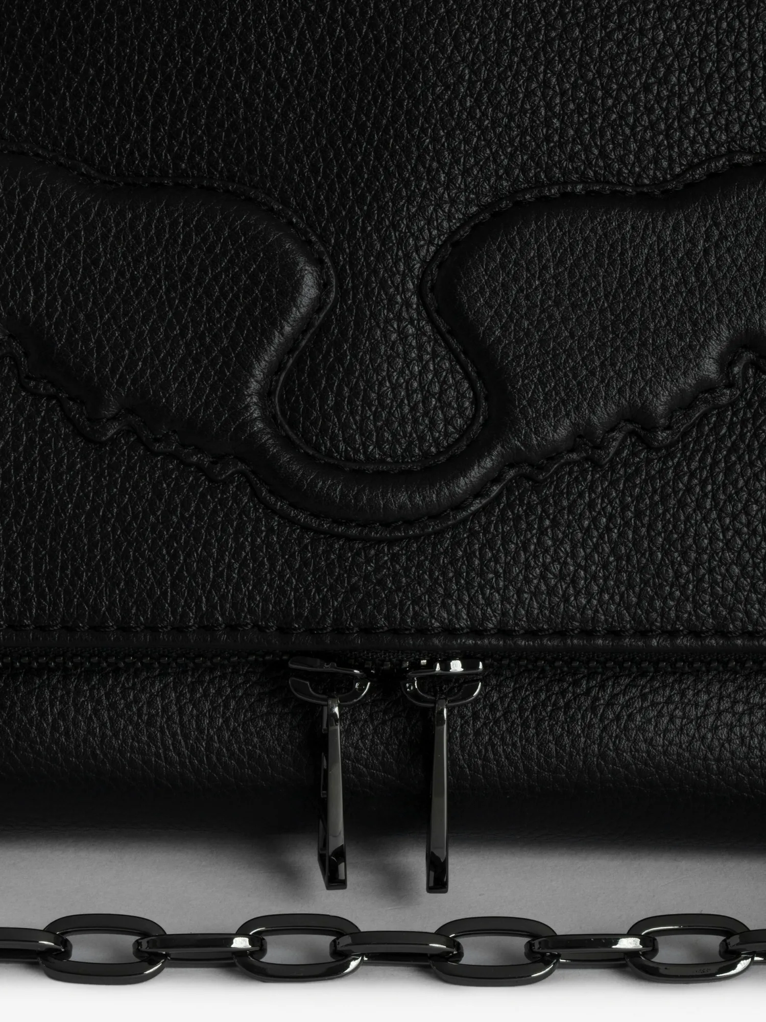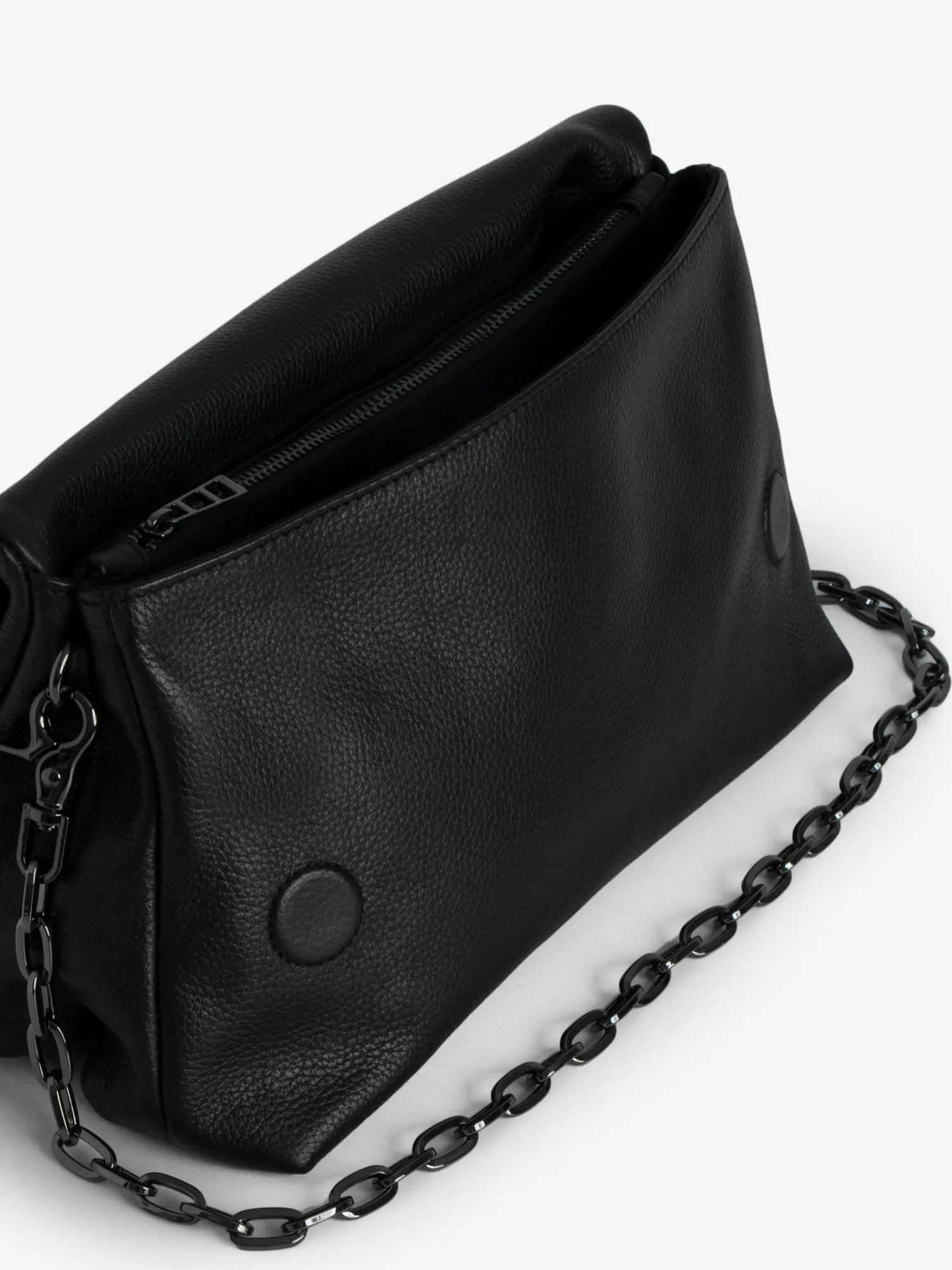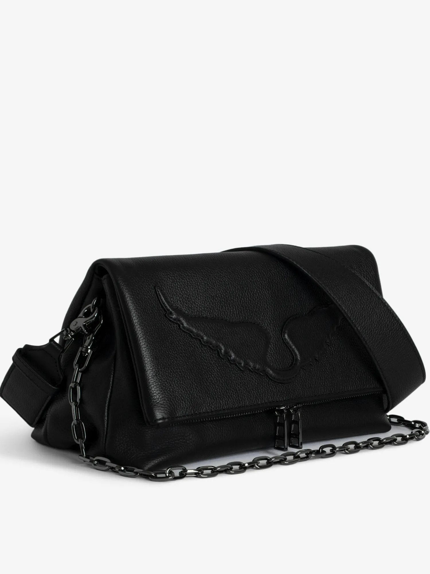 – Women’s black grained leather Rocky bag – Removable leather shoulder strap and metal chain – Flap with zip closure – Several compartments, including a large zipped inside compartment and a zipped back pocket – Lined – Textured leather wings – Can be carried in the hand or worn on the shoulder or across the body