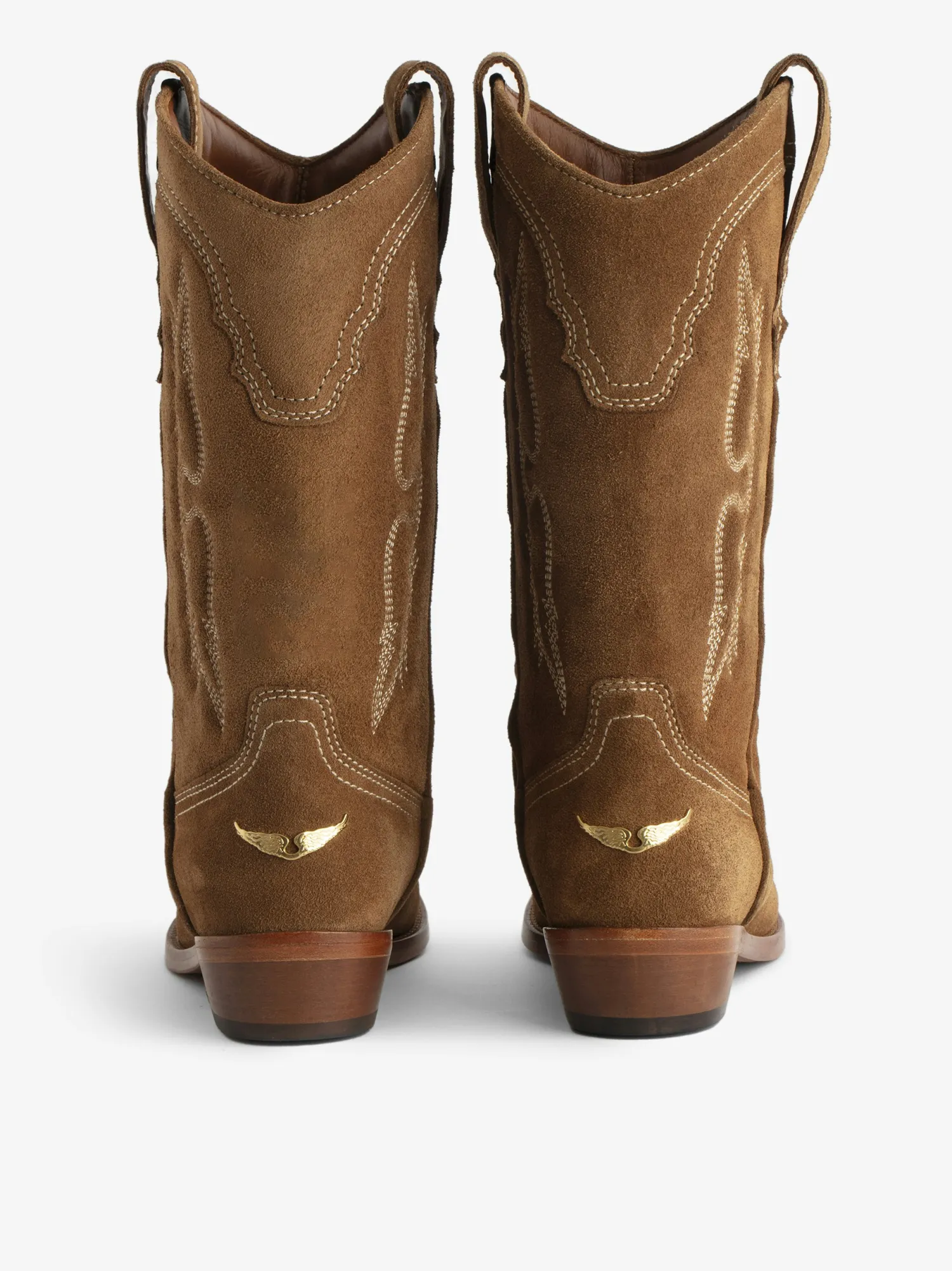 – Women’s Cognac Brown Suede western Boots – Contrasting embroidery wings and signature golden wings on the back – Pull …
