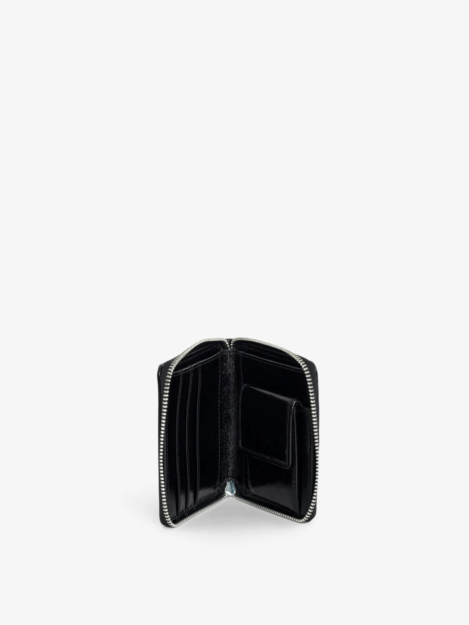 – Women’s purse in black patent leather with vintage effect – Zip fastening with metal medallion pull tab – 3 card slots, one coin compartment with press studs, one double pocket – One flat pocket – Metal wings – Topstitching – Embossed with Zadig&Voltaire