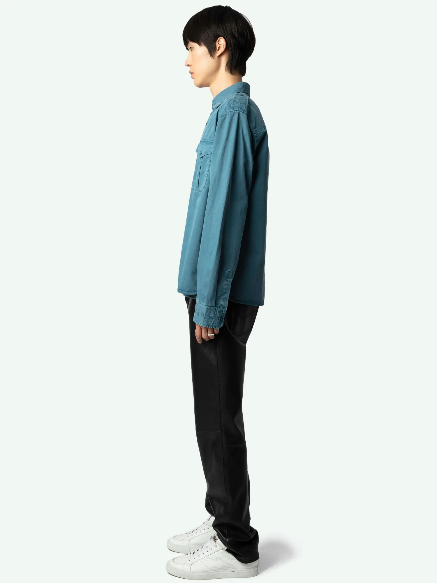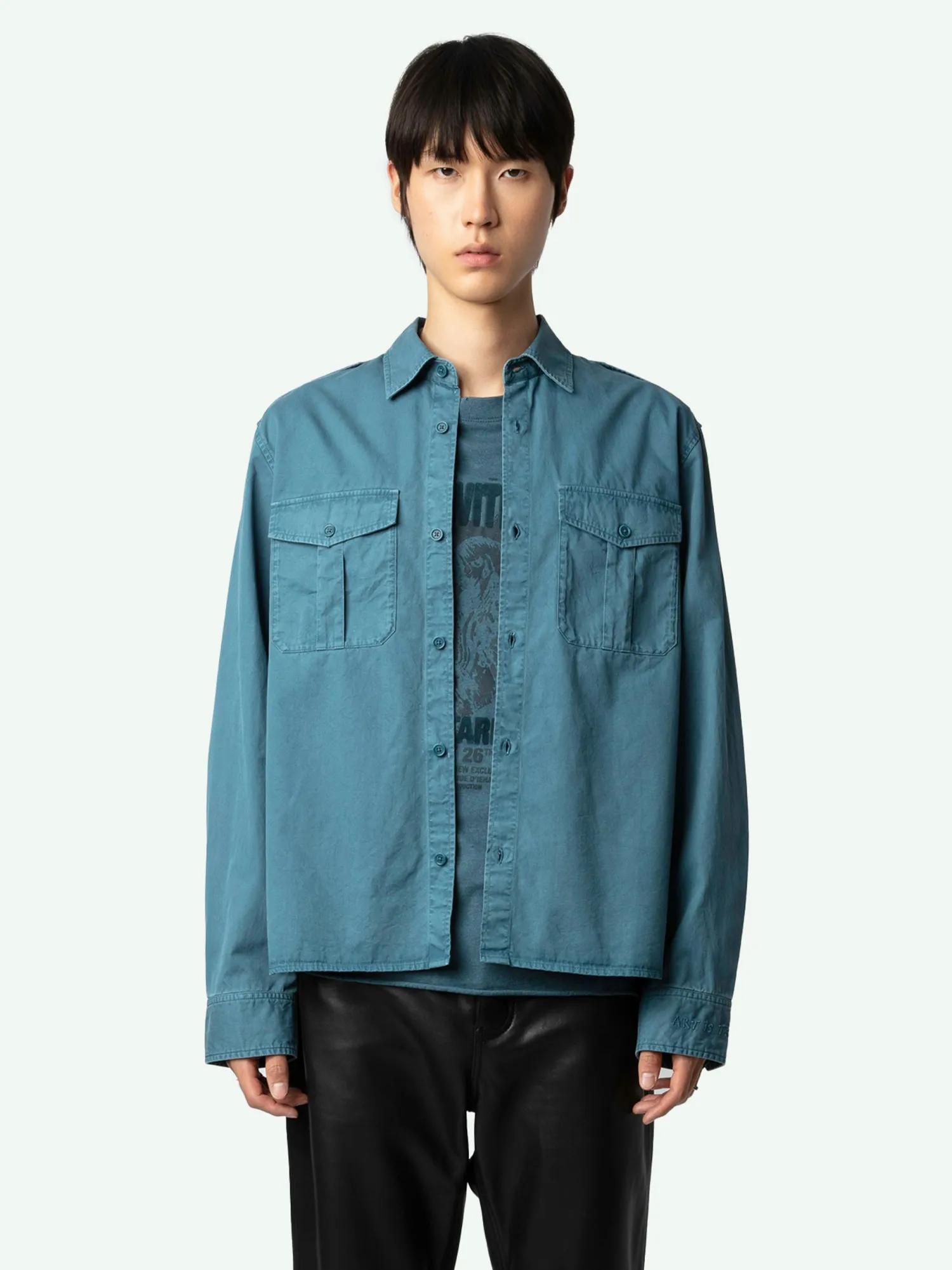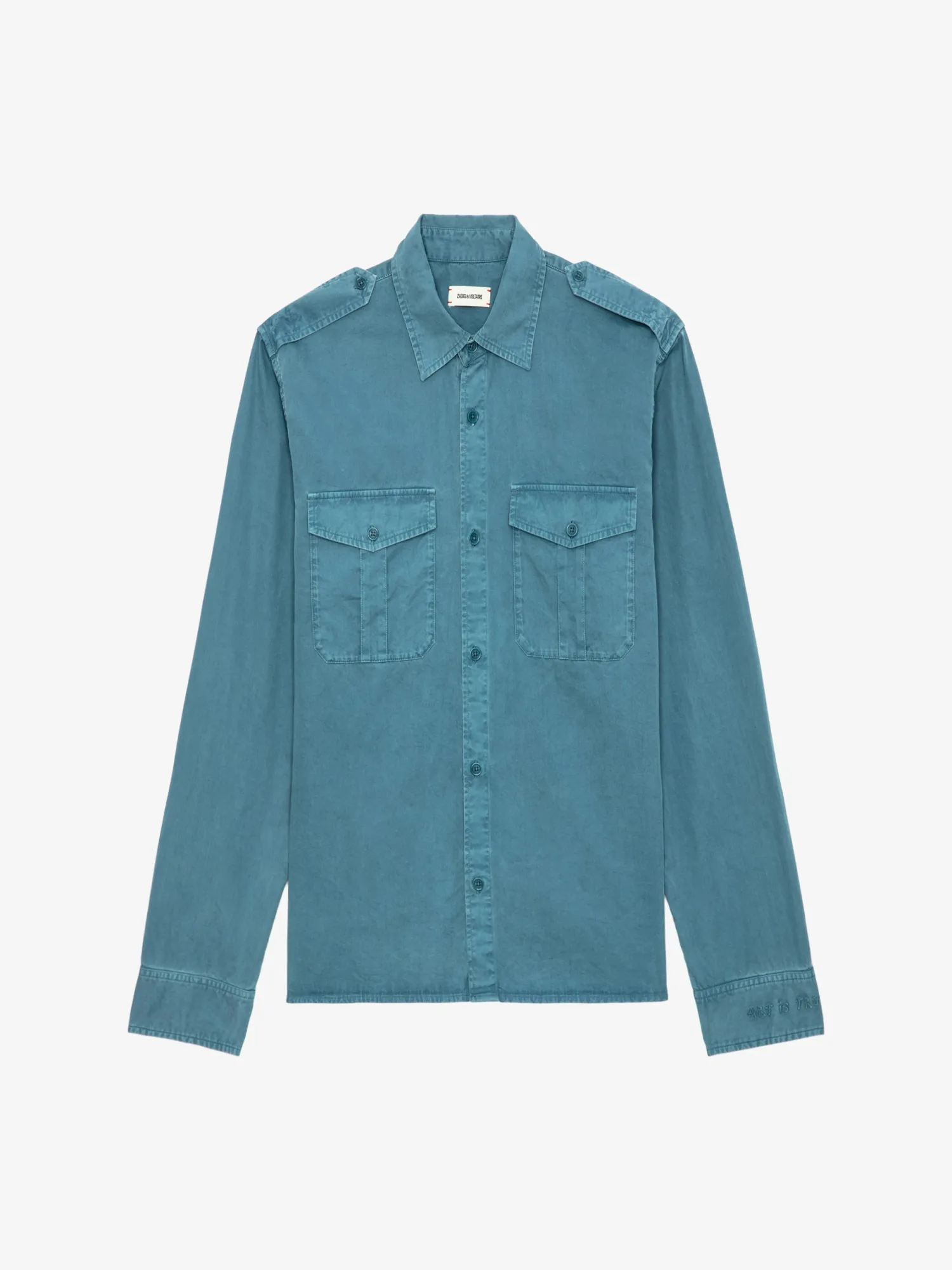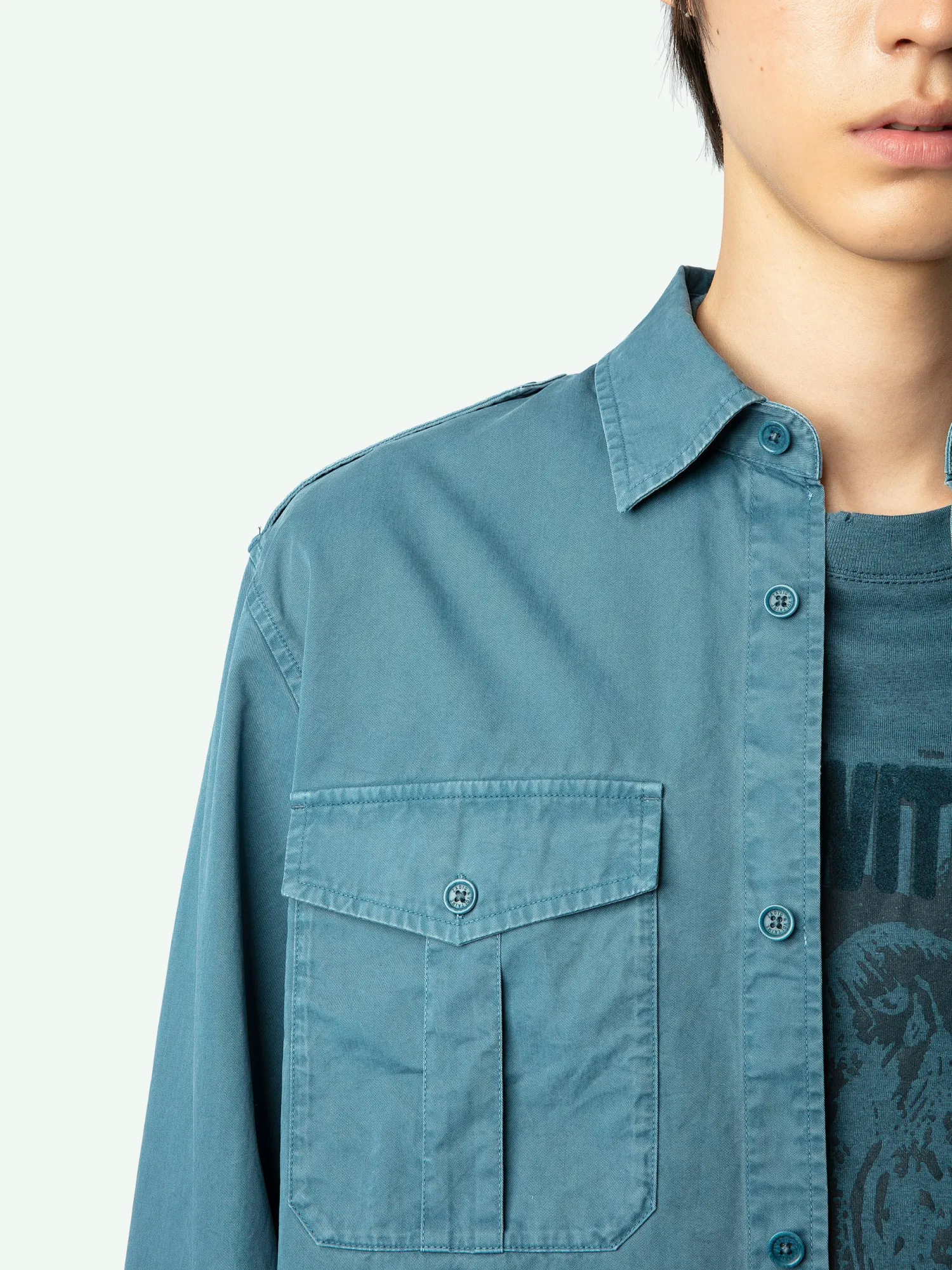 – Men’s Steller blue washed organic cotton twill military shirt – "Art Is Truth" embroidery on left cuff – Shirt collar, shoulder tabs and button fastening – Long sleeves and buttoned cuffs – 2 chest pockets with flaps – Rounded hem
