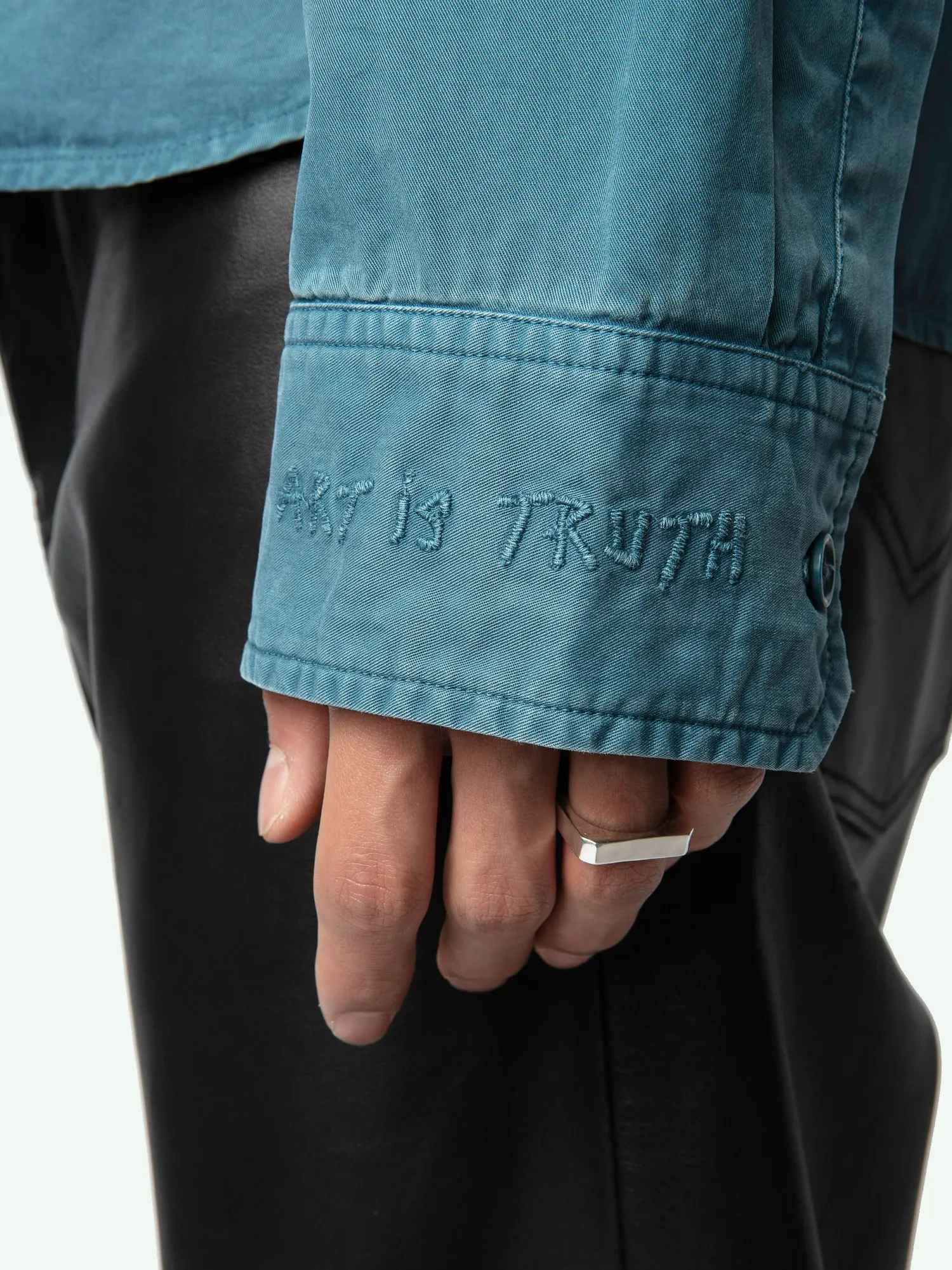 – Men’s Steller blue washed organic cotton twill military shirt – "Art Is Truth" embroidery on left cuff – Shi…
