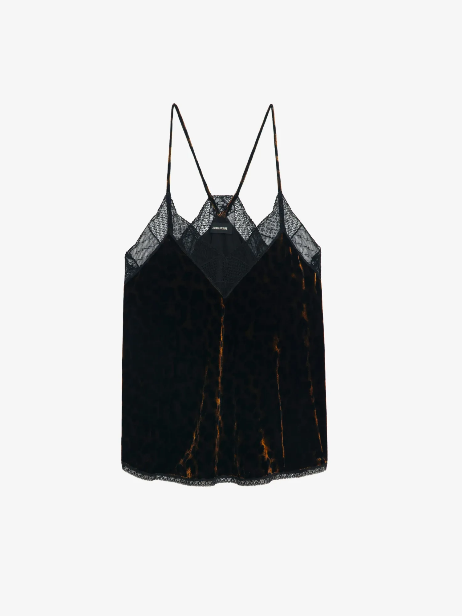 – Cognac brown velvet lingerie-style camisole for women – Leopard print with lace trims – Thin, adjustable straps This French lace has been created exclusively for Zadig&Voltaire by Sophie Hallette.