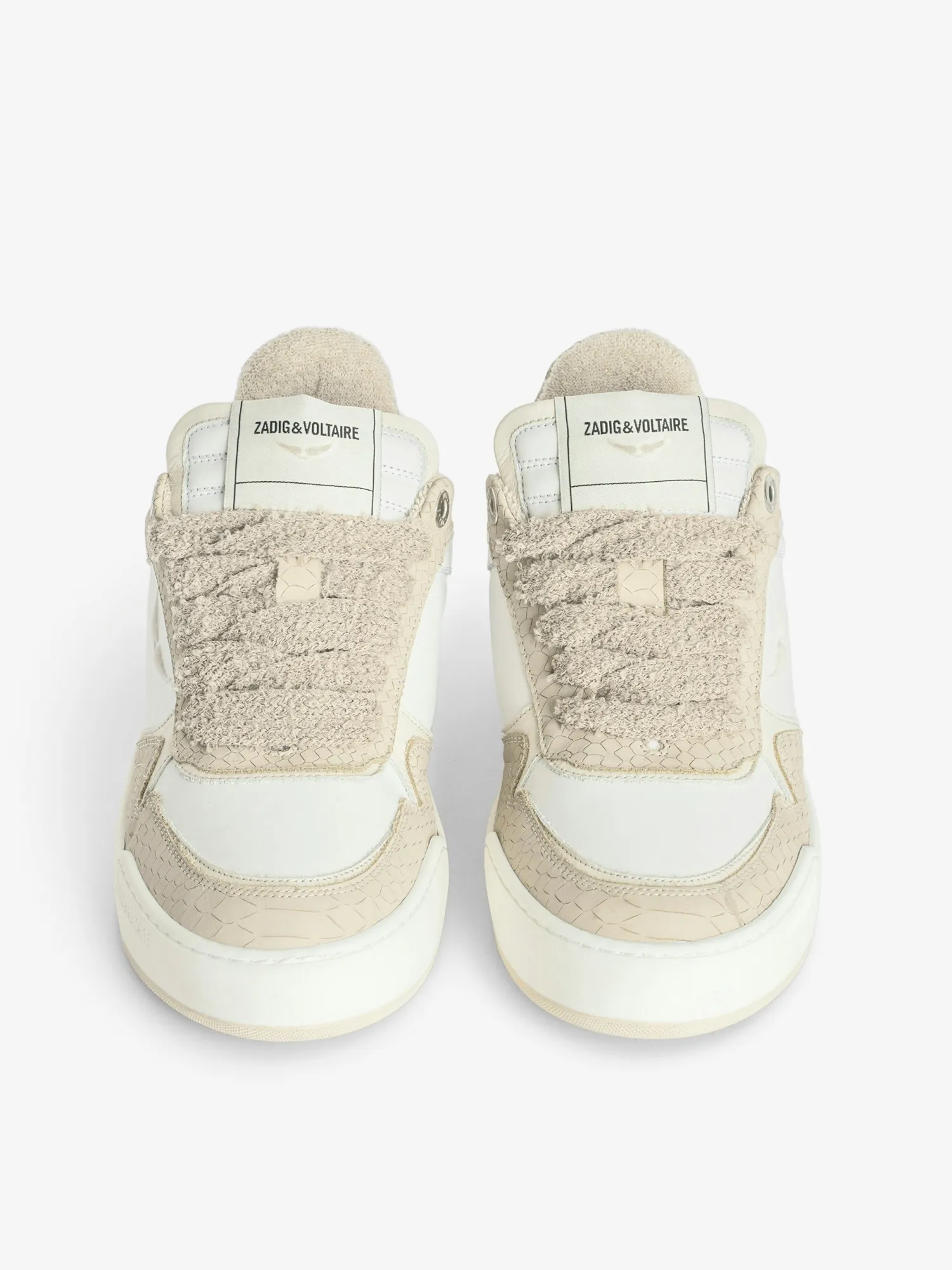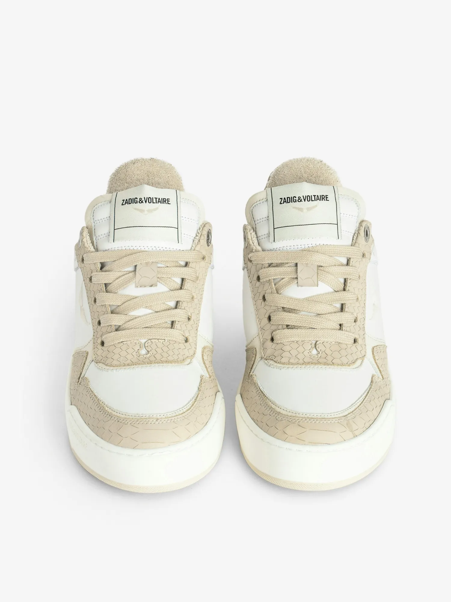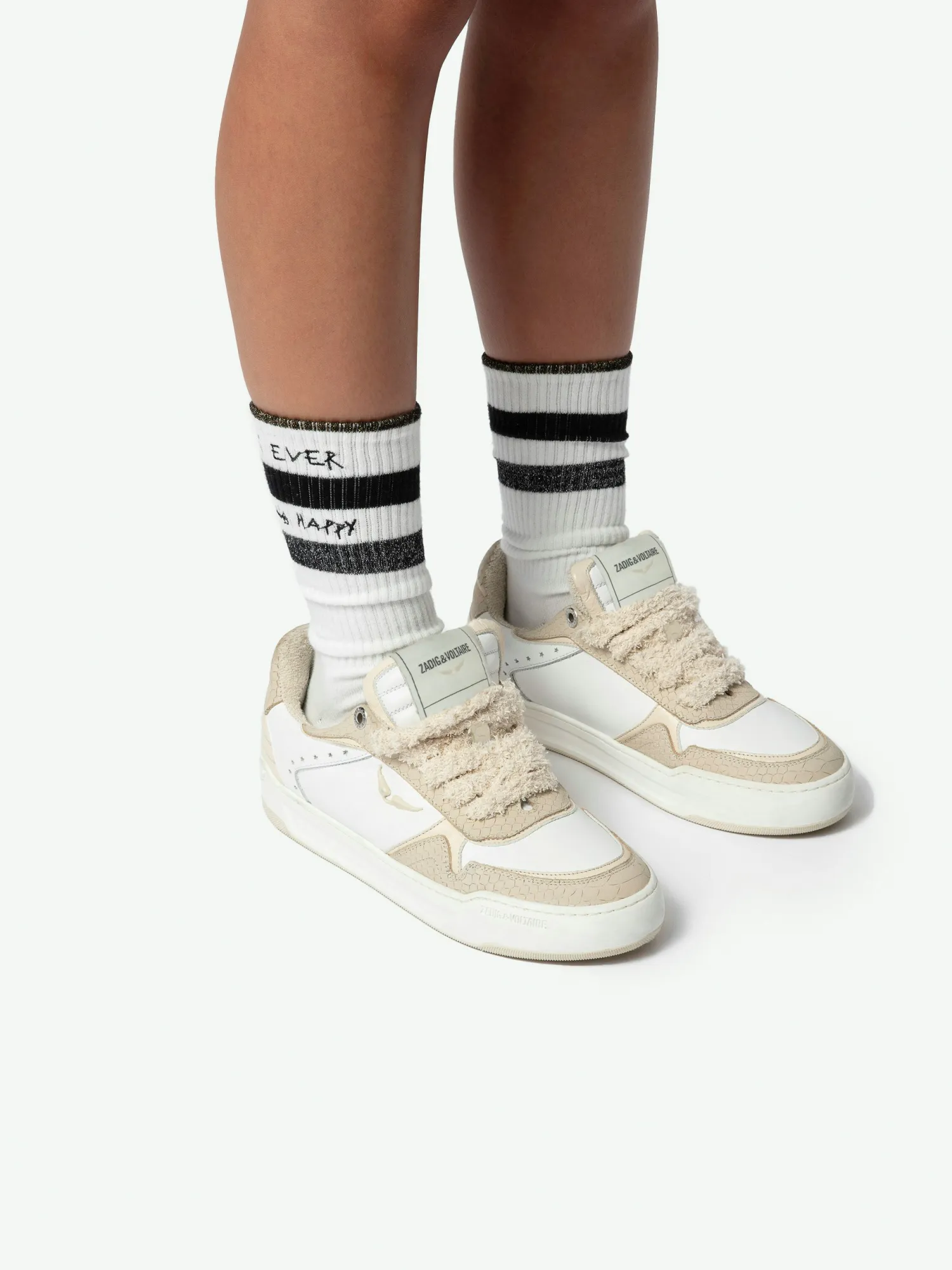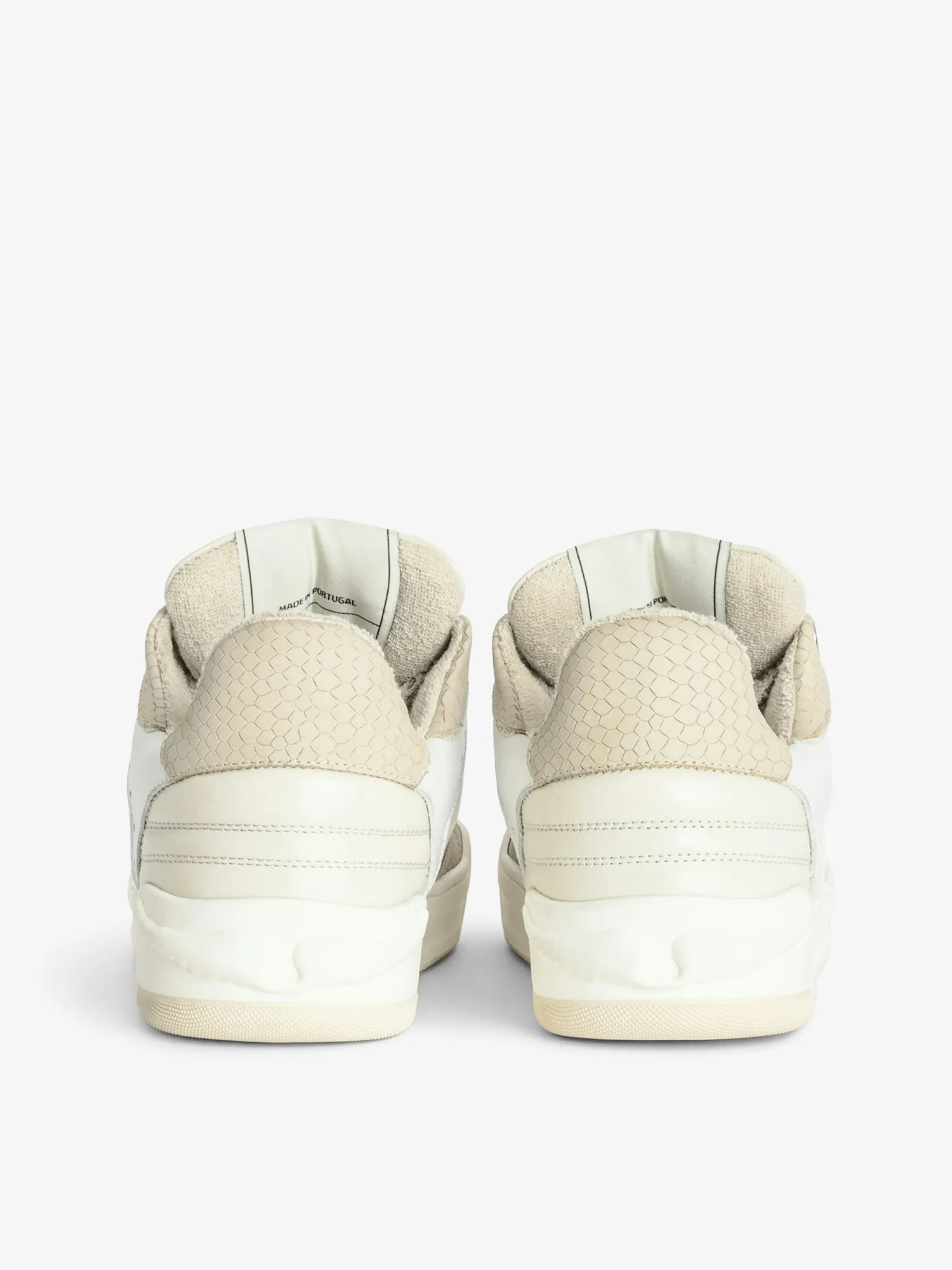 – Women’s Ice white low-top lace-up sneakers – Mixed smooth leather, contrasting inserts in embossed faux snakeskin leather and vintage leather – Topstitching, star-shaped cut-outs and domed signature wings – Two-tone sole and signature tongue – Insole height: 1.7 cm – Sold with 2 pairs of tone-on-tone laces: fluffy already inserted and classic in the box – Made in Portugal WINGS is the 1st line of Zadig&Voltaire sneakers made with more than 95% low-environmental-impact materials: – Accompanied by a unique dust bag made from Zadig&Voltaire archived fabrics in a social integration workshop close to where the shoes are made – All the leather comes from tanneries certified by the Leather Working Group (LWG) – 100% of the textiles (laces, lining, label) and sewing threads are made from recycled or organic fibres- The outsole is made from 30% recycled material